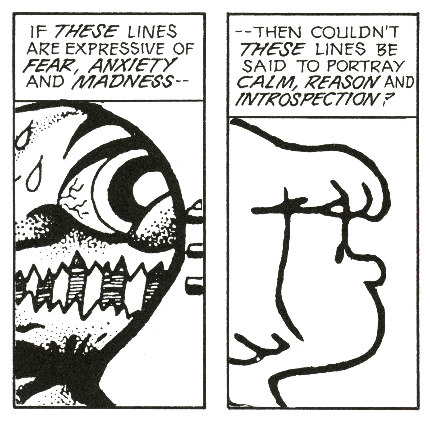 - The way the line is rendered will impact the emotion it conveys. This is also true for shape, texture, color, etc. (Scott McCloud, “Understanding Comics,” Harper Collins, 1994, pg. 119).