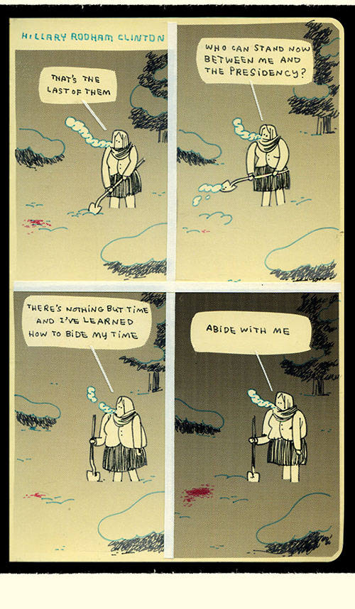This is a comic by Steven Weissman titled Hillary Rodham Clinton. This comic is a combination of illustrations and words that convey the principles that Tufte wrote about. Tufte wrote about the importance of successfully using words, numbers and images together. The comic is a combination of a few small multiples that come together to tell one story. The illustration alone tells a more ambiguous story, a woman burying something dead, while with the addition of text tells a more detailed story, Hilary Clinton burying her (dead) Presidential opponents. This is an example of successful word-image integration that Tufte refers to. Words without the images or vice versa in this case would not relay as much information but combined, it is clear story that is “data bountiful.”
