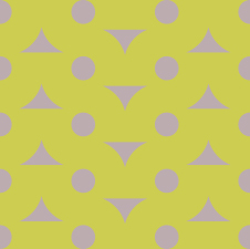Whereas, in the other pattern there is a stronger contrast between the desatuarated green and desatuarted purple, this makes it apparent that this pattern is organized in a grid. Therefore, this pattern is more geometric and is composed of circles and triangular shapes that alternate direction in every other column. This pattern also seems to be tiled with no extra space along the edges of the pattern so the circles on the boarder match up perfectly because there is no space when the pattern is tiled they overlap perfectly so that the pattern is consistent when it is tiled and creates circular and triangular forms.