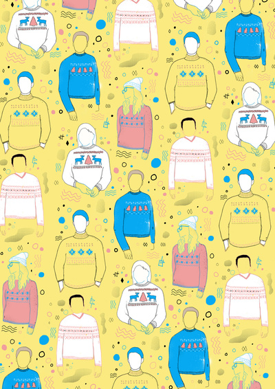 The second pattern I chose was found on society6.com by Adam Turnbull named Happy Holidays No.2. This pattern is an organic pattern with the organic shapes being human outlines. There are five different kinds of human outlines that make up the pattern. Although these illustrations are recognizable forms, they may seem to be used in an irregular way, but at closer look, they are being repeated horizontally. The use of color in this pattern is very prominent. The use of color in this pattern creates depth and space. The background color being yellow forms a pattern in itself because of the negative space. There are also smaller shapes that appear to be in the background more compared to the human figures, which are placed seemingly random. Each figure in the pattern has a different color sweater, and because you can see the color being repeated, it is easier to identify the pattern as a whole.