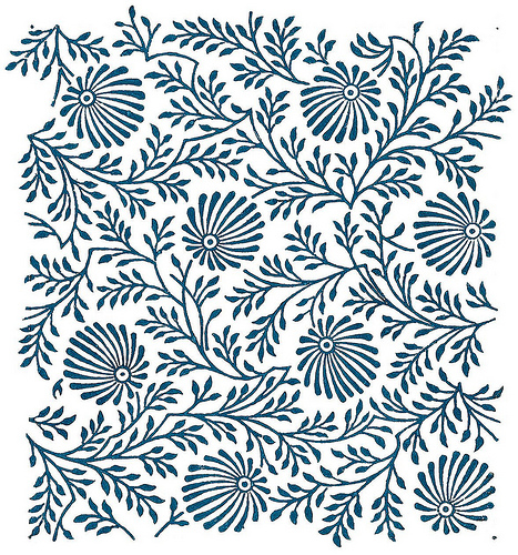 The second pattern I chose was a minimalist, organic pattern. The reason I chose this pattern was because it challenged me at first to decide whether or not it was organic or geometric. At first glance it looked to me that it had the potential to be geometric. However, through closer examination I saw that the pattern was not tiled or repeated, it had a sense of randomness because the interaction within the elements of the design aren’t always the same (between the larger, more circular objects, and the lines that make up branch-like forms). In this pattern I can identify dots within the random pattern as well as irregular lines that make up the rest of the design. This design, if it were to be printed in a larger fashion would be considered tiled as right now it seems fairly irregular and is not repetitive/repeated within this thumbnail. The cool hue of the pattern makes the design appear very calm and smooth. The dark value of the blue pattern makes the pattern appear as positive space against a white background which acts as the negative space of the design. The darker value of the blue in comparison to the white enhances the power of the pattern and reinforces the idea that it is, in fact, the foreground of the textile. Because of how dark the value is of the blue, it suggests there is no significant relationship between the white and blue, only to show that they are very different and contrasted colors, making sure the viewer knows that the focal point of the design is in fact the pattern. However, the cool temperature of the color chosen for the design does make for a more analogous and harmonious pattern. The same would not be able to be said if the color picked had a very bright, saturated, orange which would seem more chaotic and interrupted.
