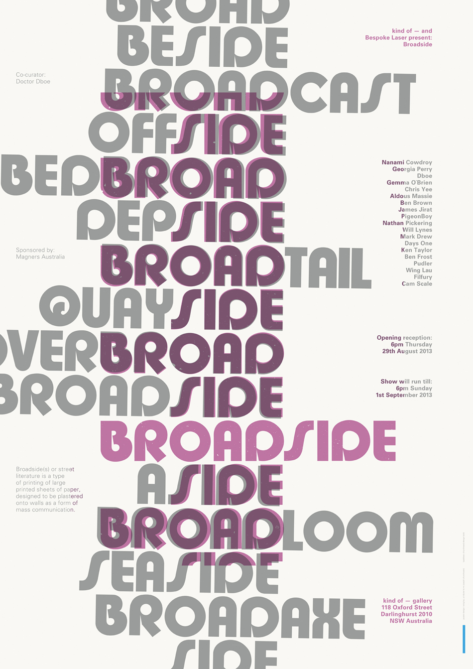 This broadside was created Wing Lau to promote a gallery showing of other broadsides by numerous artists. However I think that it itself is very good example of a broadside after reading Kyle Schlesinger’s essay. It obviously fits the criteria for being considered a broadside and even offers the definition of what a broadside is. The poster uses letterpress printing and it is put together so that the first thing the viewer reads is broad and side repeatedly. Set behind the repetitive broadsides is alternating words, which either contain the words broad or side within them. Both elements are done in display type, but the foreground lettering is done in purple, drawing the eye to it first, while the background is done in a neutral grey. The display type serves as an interesting visual element on the poster and also communicates that the events is all about broadsides. It also serves as a barrier, which divides up the page, leaving the remaining areas to be filled with the necessary information to let people know the details of the event. It appears that Wing Lau used even kerning and letterspacing throughout the design. But the purple display type appears to have been done on a flat baseline, while the grey background display types looks as if it has been slightly tilted possibly to help separate the two elements. This gives the repeating broad-sides a 3-d effect and adds further interest to the poster. Overall the overlap and layering used in the broadside creates an interesting visual design that communicates first what the event is about drawing in the viewer, and then provides the information needed to attend the event.