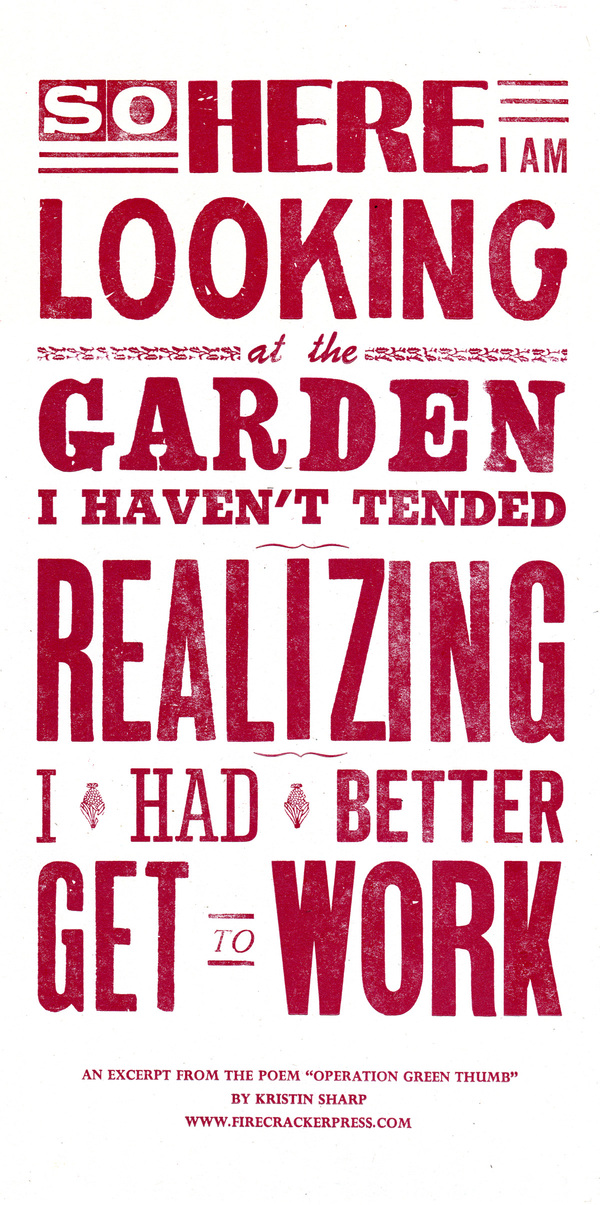 The designer chose to use a different type face for each row of the Broadside. There are even multiple typefaces used within these rows. The text is aligned in a way that creates one shape and has no overlapping or overlaying. While there is no illustrations, much focus has been put on the presentation of the words. Letter are chipped, bold, re sized, and faded to give the broadside an older or aged look. This design is a display type.The focus is on the the poetry rather than the author or name of the poem. The large scale of the text is effective emphasizing words like “Here”, “Looking”, “Realizing”, and “Get Work”.