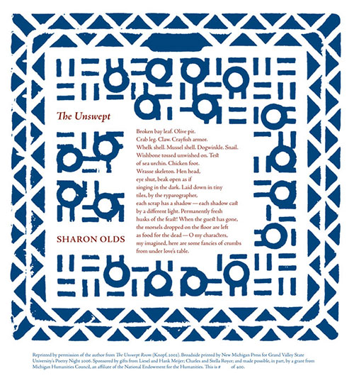 My example of a broadside is a poem, called “The Unswept”, by Sharon Olds. It puts the poem itself in the center of the page, but then uses a decorative border, along with a design in the space in between the poem and the border.
