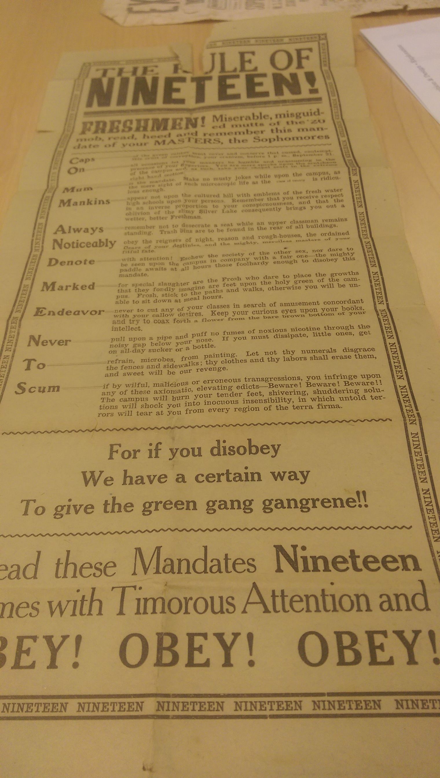 While the “Nineteen!” is certainly the heaviest pieces of text, what caught me first and got my attention was at the bottom, where it says, “OBEY! OBEY! OBEY!” now, perhaps because it was laying down and not posted, that affected what I saw first, but because of it’s size and because the leading in that section was further apart, it really separated itself from the rest of the broadside. As you work your way down the poster, the leading in general seems to get wider, giving it this feeling of thinning. It makes the top seem heavier, but the bottom stuff feels a bit more important because of readability. As though the goal were to make the rules seem overwhelming in order to intimidate the freshmen, but then to make the idea of Obeying seem simpler, to encourage a mind-set that life will be easier if the Freshmen just play along and don’t try to cause trouble.