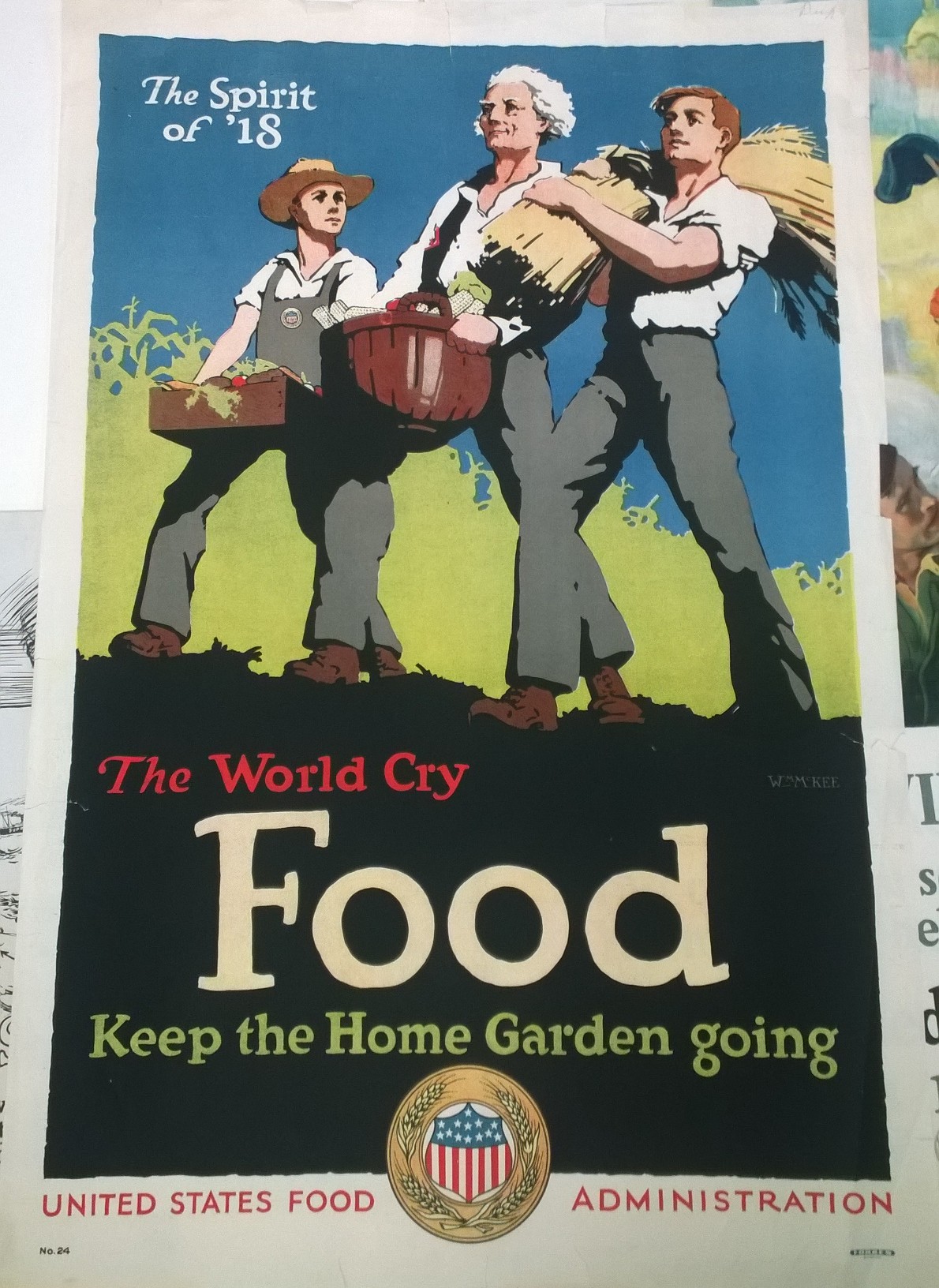 One of the broadsides that captured my attention most while browsing through the MASC Collection was this, a broadside related to food. When categorizing this broadside, I wasn’t quite sure if it was Integrating Display Type, where the display type is so prominent and striking that there is no need for any additional imagery, or if it was Integrating Images where overlaps and intersections between text and image are beautiful when examined in detail. The word “Food” is obviously the largest and most eye-catching piece of the poster, but the image is successfully integrated as well. This broadside uses simple yet effective colors that properly capture the essence of the message. The word food is written white on a black background which creates a high contrast that draws our eye in. Then, the words, “The World Cry” are written in red, perhaps to convey a dramatic, passionate feel. And under that, “Keep the Home Garden Going”, is written in green, a fitting color for plant-related issues. Below the text, there is a United States Food Administration badge which looks like an official seal of approval. Above this text, the illustration uses a blue and green background further emphasizing the environment, and then sticks to neutral colors like grey and brown for the people. The people look like strong, stereotypical American men. Their general posture looks important and inspiring. The words “The Spirit of ’18” are written in white against the blue sky in the top left corner. This serves the purpose of contributing a patriotic, unified feel to the broadside. There is only one typeface used throughout, but the word “The” is always written in italic. The display type is almost so effective that you need nothing else, but the other words and images integrated together create a feeling of completeness in the poster. Using few and simple colors, the artist was able to effectively make parts of the broadside stand out that needed to stand out. The overall design of this poster is extremely inviting and eye-catching. The use of typeface, color, and design placement all contribute the success of the broadside.