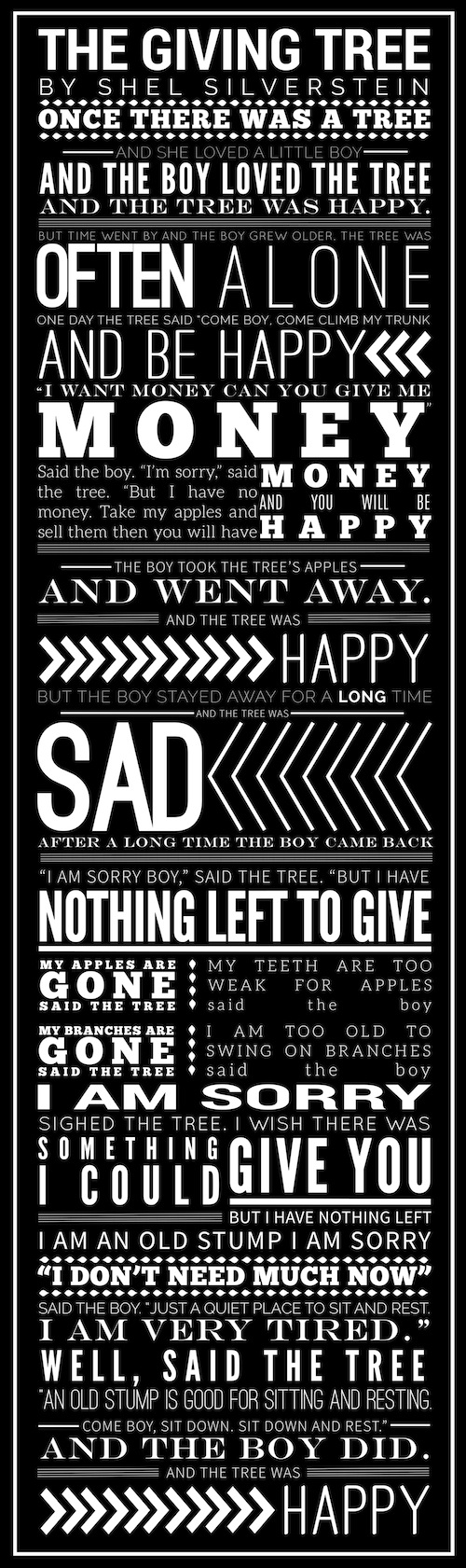 This text is very heartwarming and thought provoking. There is a simple yet complex story being told of a lifelong friendship built on helping one another. The tree helps the boy and the boy makes the tree happy by taking what it has to offer. The mood has a somberness about it as well as a pleasant gentleness. This feeling is not only conveyed by the text itself, but is also shown through the way the text is represented.