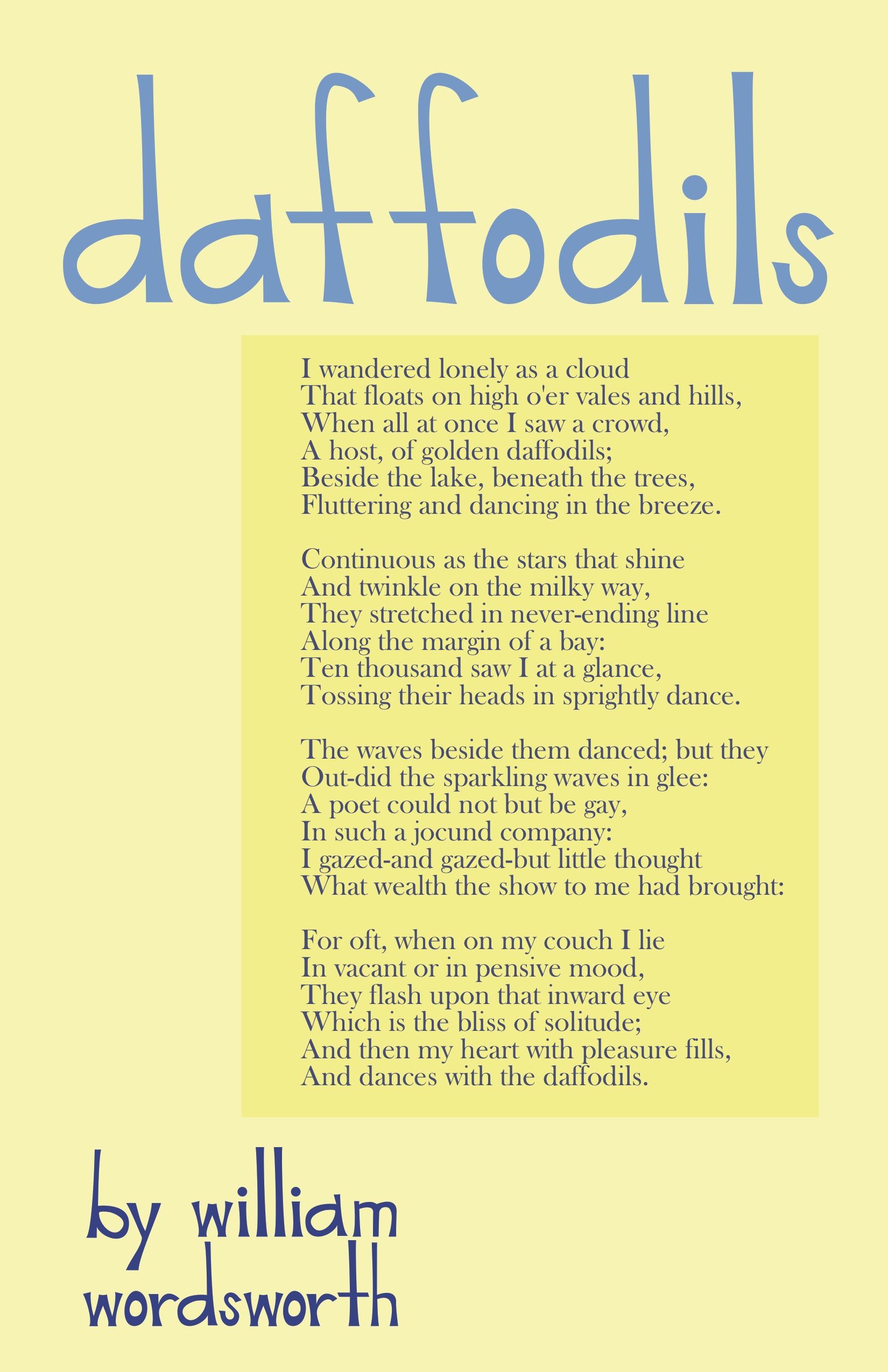 The design of this broadside by Melissa brings a sense of playfulness and warmth to the poem by William Wordsworth. The poem is about a field of daffodils and the way the narrator remembers the daffodils as happy beings dancing in a never-ending field. The mood of the text is cheery, uplifting and reminiscent, in a sense that a grown person gains contentment when remembering a specific event.