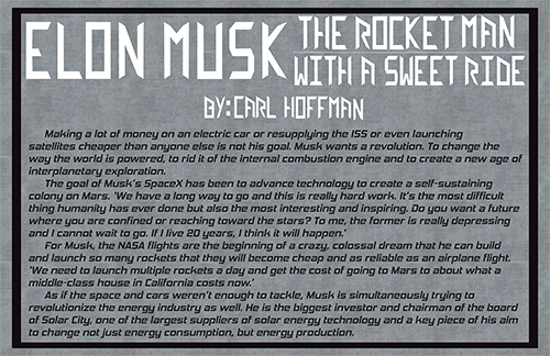 After reading and observing Evans broadside I get the feeling he is trying to show of futuristic and space exploration. The text is an excerpt from an article about how Elon Musk has been working to advance technology to create a self sustaining colony on Mars and the ways he is working through it. Futuristic technology advancement into space travel is the meaning being portrayed by the text. The font Evan design as the display level text is very geometric and slanted and the body of the text is set up with a different bold space age font. These elements help give off the mood of being desolate and futuristic.