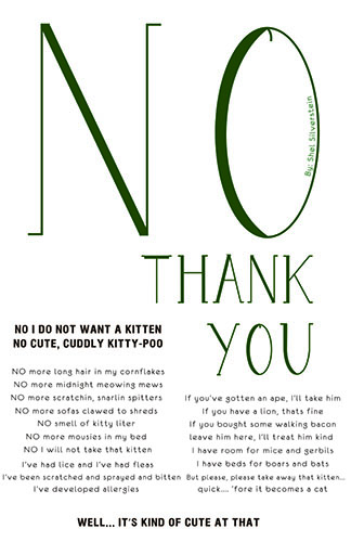 The piece uses black and white. You could interpret this as though its black and white like there is no medium or gray area about it, there is only yes or no and no in between. The use of space though could give a feeling that even though there is this main point of NO, there is room for change like the how the author started to change his mind on kittens at the end of his poem.