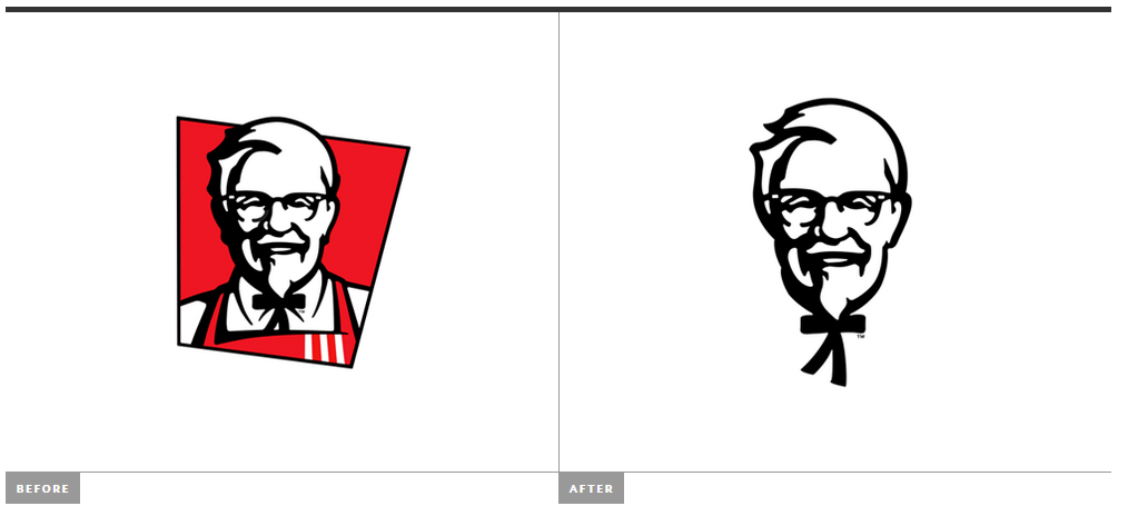 In terms of design, the more minimalistic change has proven to be effective in recent years. The reason being that by using only representative elements, it can be meant to send out a stronger message. As in in the both images, Colonel Sander’s likeliness is well known to all and acts as a focal point for the piece. So by removing the other factors and only including his face, the redesign tries to use only his well-known face in hopes of creating a stronger image. I would say that the redesign has a more organic feel to it as the face is not being framed by a box and has free form lines aside from the bow tie. The weight of the lines also changes a little bit between the two designs to give it a lighter feel in the redesign. I think the author did a great job creating a minimalistic version as the old colonel was representative with the older standards of the business as recently, the business had decided to change some of its long lasting principles. Along with that, I think that adjusting to a minimalistic design is good because of the popularity of it in modern times.