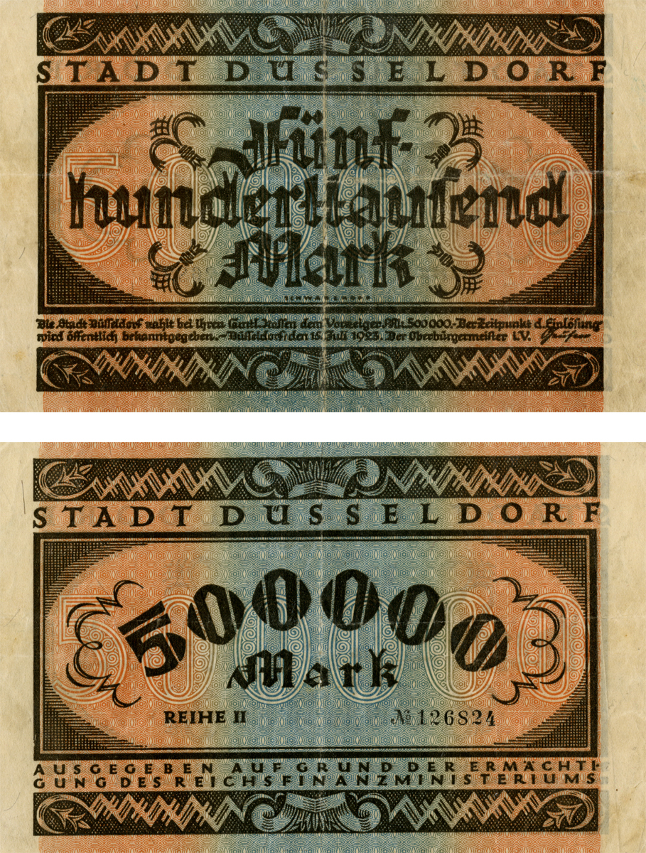 From what I can tell the bill has four different typefaces. The typeface that makes up “Stadt Dusseldorf” is a pretty basic serif typeface. The black printed 500,000 is very bold. In each digit there are lines intersecting the sides. “Fünfhunderttausend mark” appears to be a German Gothic script. It is outlined. The “Mark” on the reverse side is the same script but is solid, instead of outlined. It’s interesting to note that the word fünfhunderttausend is one word yet it is hyphenated. Presumably this was done to help with the design. Having the four letters “fünf” and “Mark” above and below the hunderttausend balance the bill out. It would probably look a little wonky if Fünfhunderttausend was squeezed in there on one line.