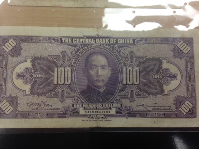 The currency that I have selected here is an old bill from Shanghai printed by the Central Bank of China (although I believe it was printed in the United States for reasons I will state later). The currency is in the denomination of 100 and was printed in the 1860’s. I believe it was printed in the US because of the english style of imagery and image placement as well as the text on the front side of the bill. The denominations in the corners, the extremely complicated geometrical patterns (for counterfitting precautions most likely), and the face in an oval in the middle of the bill are all traditional things found on American currency. What really makes me think this though is the english lettering found on the bill that reads “The Central Bank of China” , ” One Hundred Dollars” and “Shanghai”. I tried to think of reasons why a Chinese bank in the 1860’s would use english lettering on the front of their bill and the main thing I could think of was it was printed in the US. There are even signatures on the bottom left and right sides of the bill which are also found on US Currency. The color scheme is very simple and things are very symmetrical on this bill and are fitted nicely by a rectangular pattern that encompasses all the information (images and type).