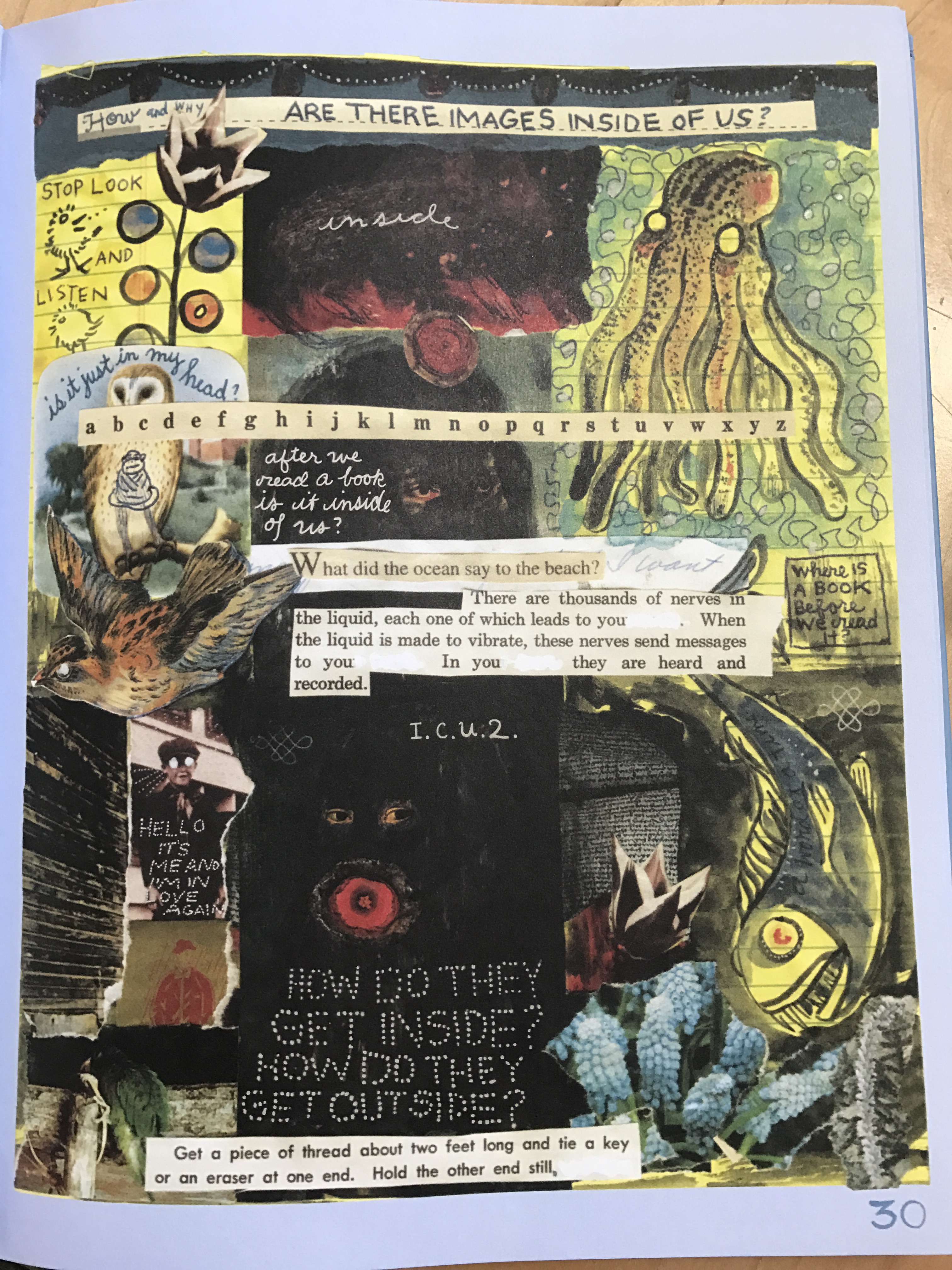 While reading What It Is? By Lynda Barry, I discovered that Lynda Barry is directing the reader’s attention to the human’s ability to dismiss a thought or an image of creativity. As people we doubt ourselves and in the reading, the character presents the difficulty of discovering more creativity. Throughout the reading, Lynda Barry forces you to think about these things and asks a lot of questions. For example, on Page 30, she asks “How and why are there images inside of us?” This is one of the many pages that directly correlates to the idea of Formstorming. On this page, there is a collage of images and words that could be examples of images in our minds. This page could be seen as a form of formstorming just in the way it presents each of the pictures in different ways. In the image, she presents her expression of imagery by placing a variety of images on this page.