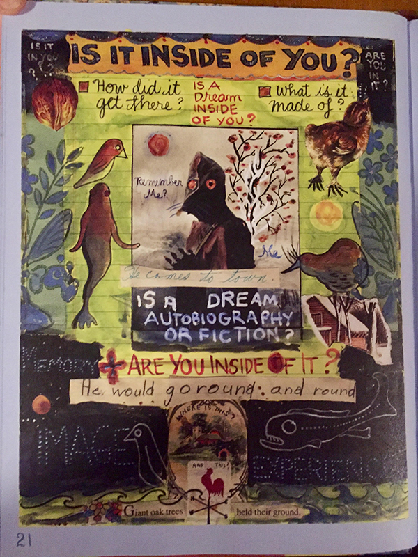 Reading through the first fifty pages of Lynda Barry’s What It Is, you will notice a trend that Lynda asks several questions like, “What is an image?” and “Where do they come from?” She asks these questions many different times and in many different ways. By this, I mean that she uses different phrasing for asking the questions or she uses the same phrasing but with a different style of text. Throughout the book, she uses her creativity to find her imagination and the images and words used on each page resemble something called formstorming. Formstorming as explained in Ellen Lupton and Jennifer Cole Phillips’ Graphic Design: The New Basics, is a way that designers and artists can use one certain theme throughout a page or several pages, and they can stylize that theme and make several different variations to text or images in a creative and very unique way. There are examples of formstorming on practically every page of Lynda’s graphic novel. Shown in the picture is an example of formstorming from page 21. There are birds of different shapes, styles, and textures, as well as several questions about images and dreams and where they come from. Lynda uses a collage style of different cutouts of words and drawings that are layered over the top of each other. The lighter cutouts and the areas of the picture that are larger are what noticeably stand out when looking at the page as a whole. All of the pages are similar in collage form and the graphic novel is visually appealing from front to back.