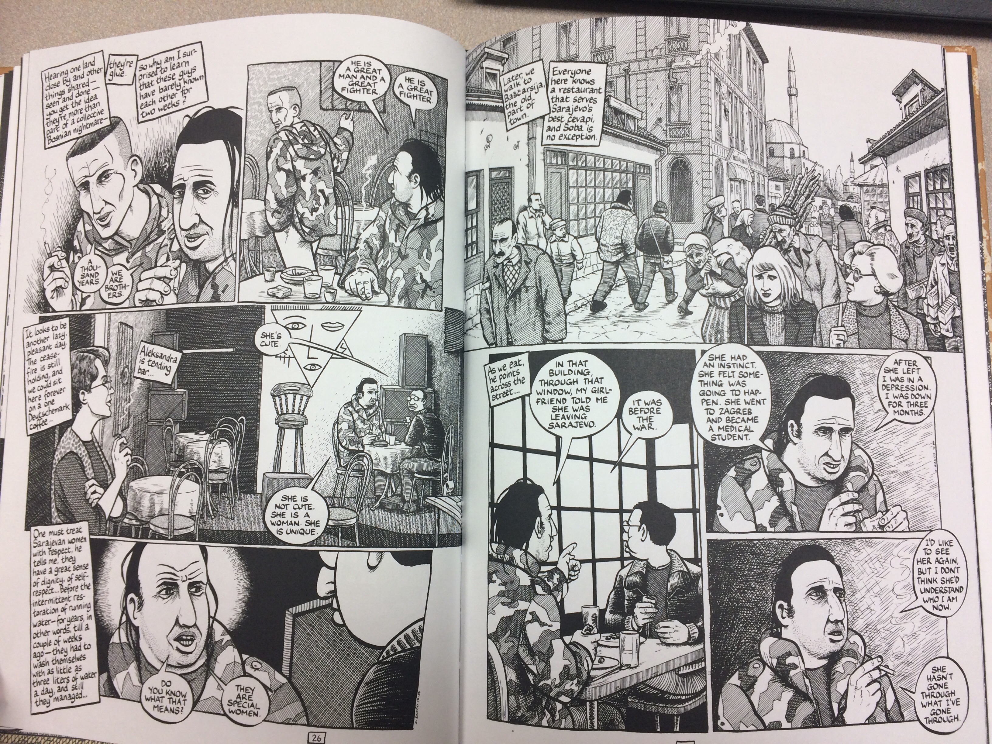 Examples of point, line, and plane can be found throughout Joe Sacco’s graphic novel, War’s End: Profiles from Bosnia 1995-96. Sacco’s uses a familiar comic-book type style to tell several short stories in his novel. Lipton and Phillips describe the way points and lines can be used to create images, along with shading. Something I immediately noticed about Sacco’s book was that it is entirely black and white in color, and many images were especially dark. Not only does Sacco use shading to create textures and patterns, but he also uses points and lines to shade the backgrounds of his images. This, paired with the emotionally dark nature of the stories, made Sacco’s stories especially powerful, because we see, and thus feel, the deep, painful, mysterious emotions of the novel.