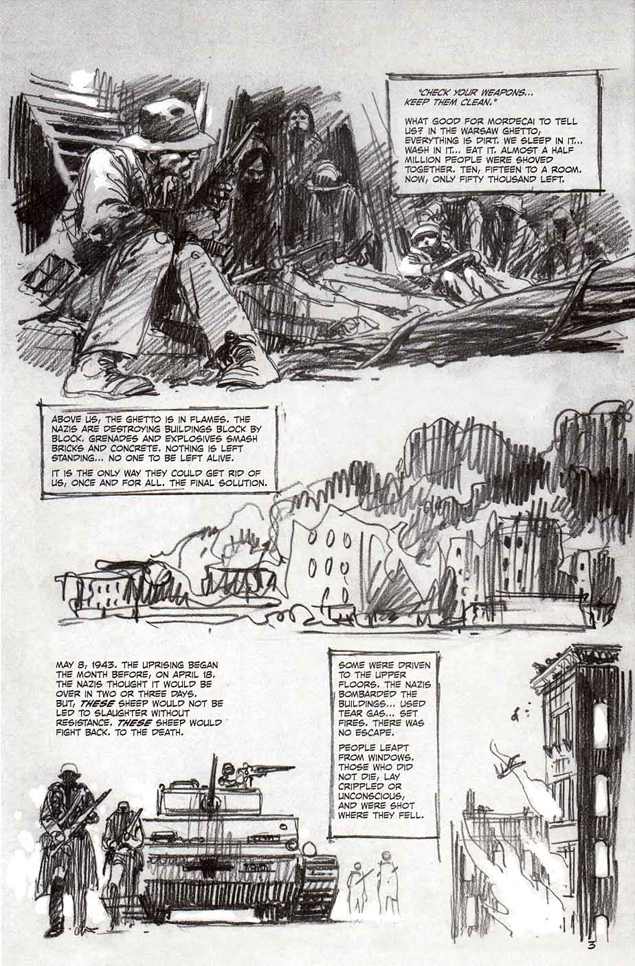 Reading the chapter “Points, Lines and Planes” in Graphic Design: The New Basics by Jennifer Cole Phillips, I was able to understand the importance of point, line and plane in the field of design and how the interaction with one another can represent anything from emotion, texture or even spatial distance. The book describes point rather simply, as a single position in space but when manipulated in its size, and positioning towards other things around, it can have many different meanings. Line was described as a series of connected points or the path between two points. Similar to a single point the way that a line is rendered can influence the perception of things like space and texture, however lines don’t always have to be physically seen as they can also be implied by the space around them. A plane is a flat surface from a closed line. Shapes are an example of planes and with the help of points and lines can create the perception of space or volume. The graphic novel that I read Yossel by Joe Kubert is about a Jewish person who enjoys drawing during WW2 at the Warsaw Ghetto Uprising. It is implied that the illustrations in the book are done by him given from the fact they all look like pencil sketches of events that happen in his life. The way he creates images as seen in the first frame above, really capture the emotion of sadness that is present in many of the Jewish people affected by this time. In the second frame although less detailed still reminds you that this is a sketch done presumably by Yossel of the Warsaw ghetto in flames. The last frame is arguably the most detailed, in my opinion this was done intentionally to show how “clean” and “organized” the Nazis are compared to the Warsaw Ghetto Jews who are fighting back. These three frames show that without reading the story or being their firsthand you can sense the atmosphere of the situation just simple design choices like lines, shading and framing.