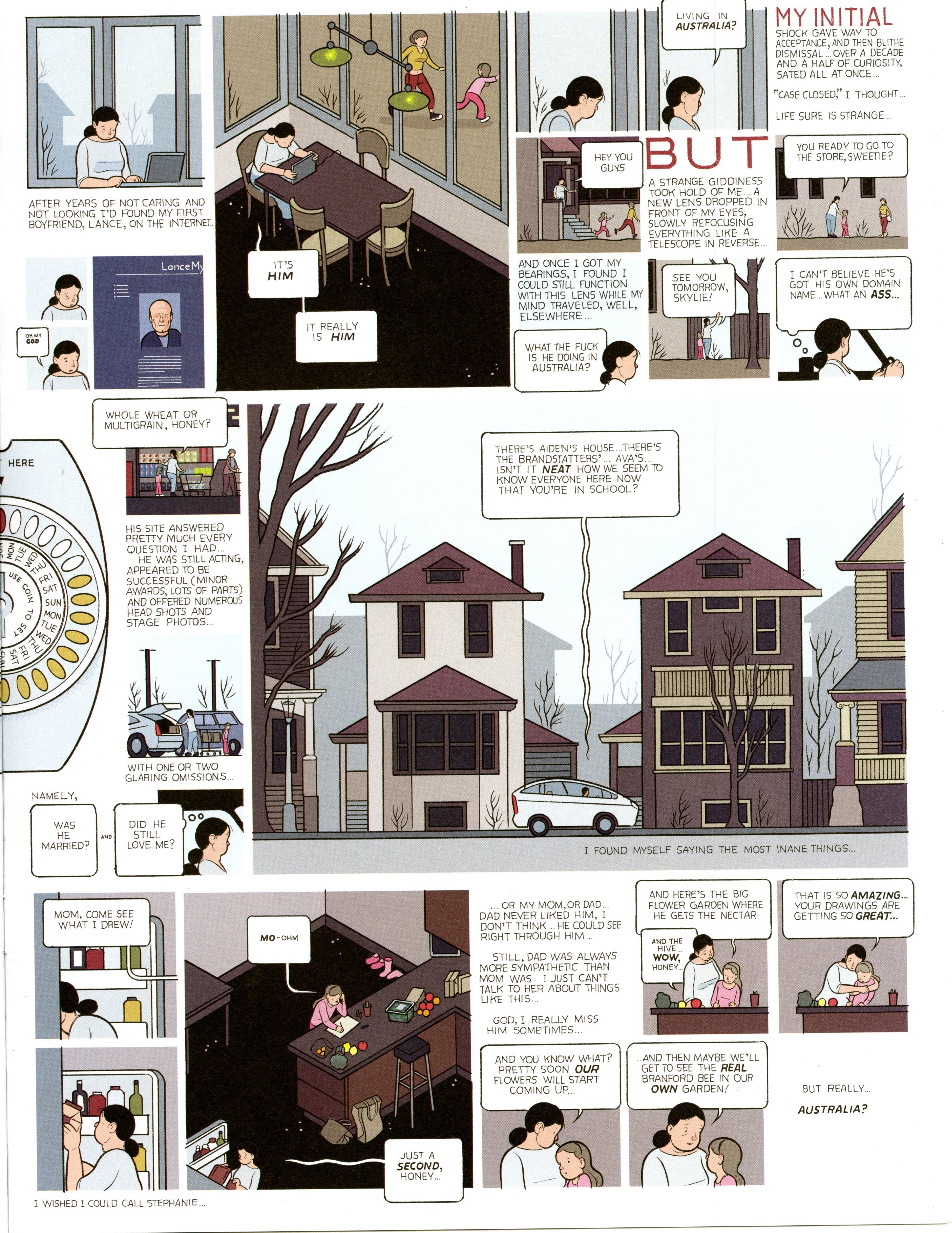 While reading the new chapter Framing, I realized that a frame is both limiting and limitless. From the collection of graphic novels, I chose to write about Chris Ware’s work. In this particular layout he chose to work with implied frames for the images and for most of the typography he chose to create a border. The page where the content sits serves as the main frame that limits the space. Although the space is limited, by using the concept of frames within frames, we have an abundant amount of choices to create the most aesthetically pleasing and effective layout to display the content. If we were to get into more detail, we could also talk about the many other frames that are being created in the actual illustrations. For instance, the borders around the window create a frame for the glass and the list goes on. Something I noticed and found interesting in this particular image, was that the artist at times uses the alignment of the text to create an implied frame. Lastly, I also noticed that with the word “but” the scale changes which helps create the implied frame on that individual piece. Like I mentioned, frames can be limitless and playing around with the scale, position or type of frame can contribute to the overall effectives of the design.