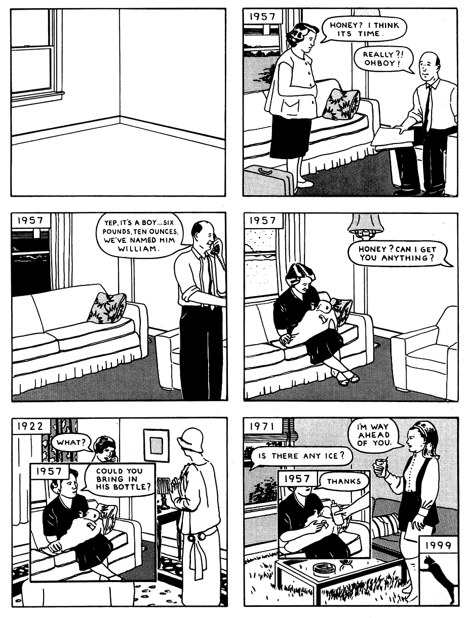 Richard McGuire’s uses borders like this in his graphic novel, Here. Boxes of the same size are created using thin black borders, in which images that tell the story are drawn.