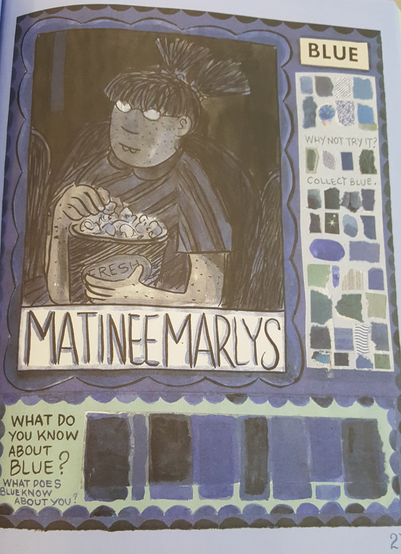 With the other framing, Barry also has a picture zoomed in on a character, which looks as if it has been cropped from a larger picture, presumably one of the girl sitting in a theatre. This works to scale the picture, making it seem bigger than it might have before. Another part of Barry’s framing on this page is her use of borders in a darker blue around the picture and sections (or on the edge of the inside of the smaller pictures). Even though these simple borders are indeed blue, they are dark enough to separate the parts of the page and offer another way of calling attention to the piece as a whole.