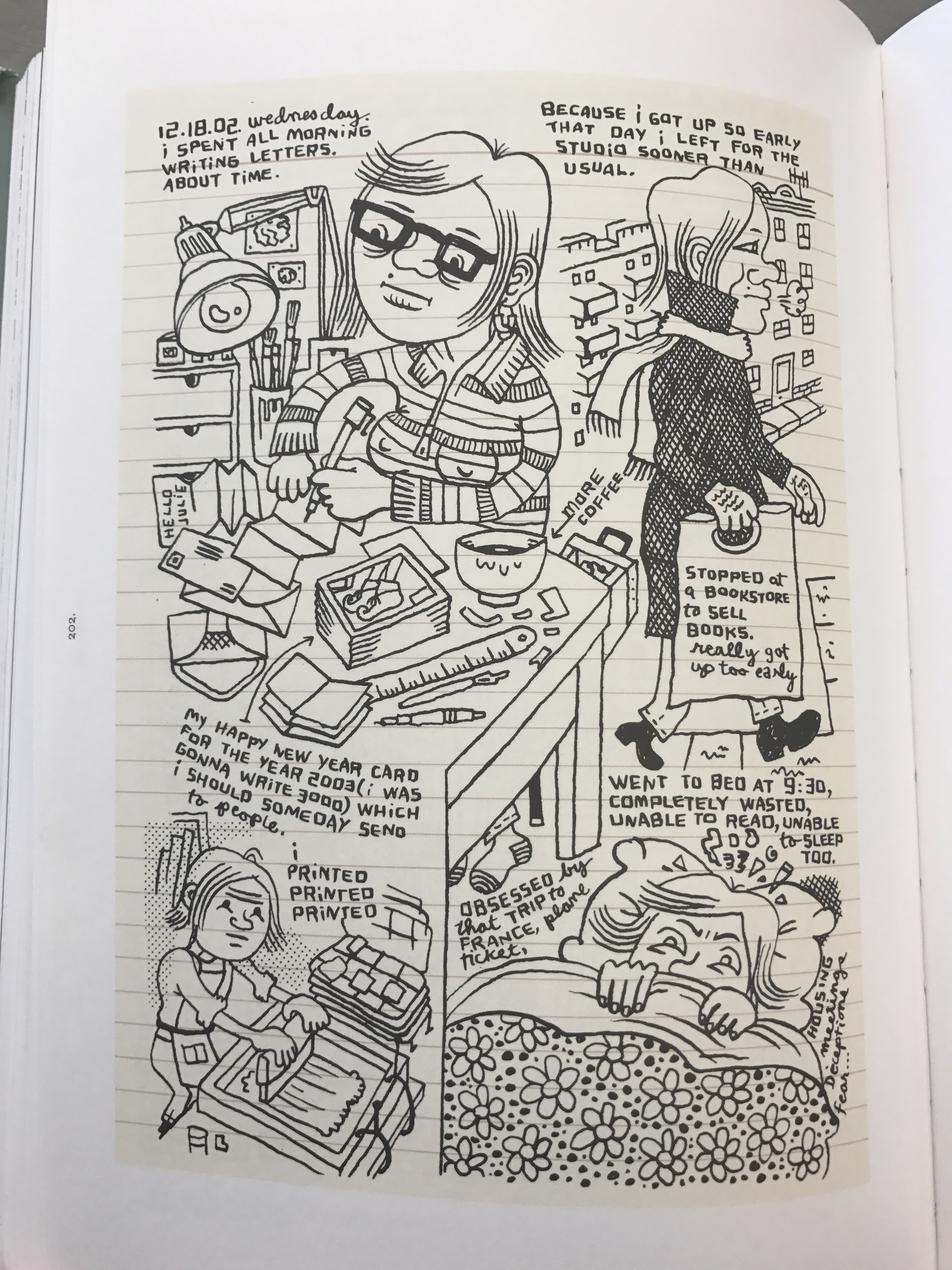 Since the story of this comic is about her waking up early and writing a bunch of letters, she uses a filler paper as the background of her comic. Even though she does not use panels for her comic, the paper is considered a frame. Framing is used to allow the viewers to focus on a certain character or scene. The use of the filler paper separates the composition from the white margins around the page of the book. I also think that the bottom left scene of her printing has somewhat of a frame, by the line that separates the printing and bed scenes. She also frames the text in the top right scene of the character holding a shopping bag. In addition, unlike What It Is, Lynda Barry does not use color in this comic. Lastly, because of how busy the comic is, Lynda Barry also uses cropping to focus on the character and how her day is going.