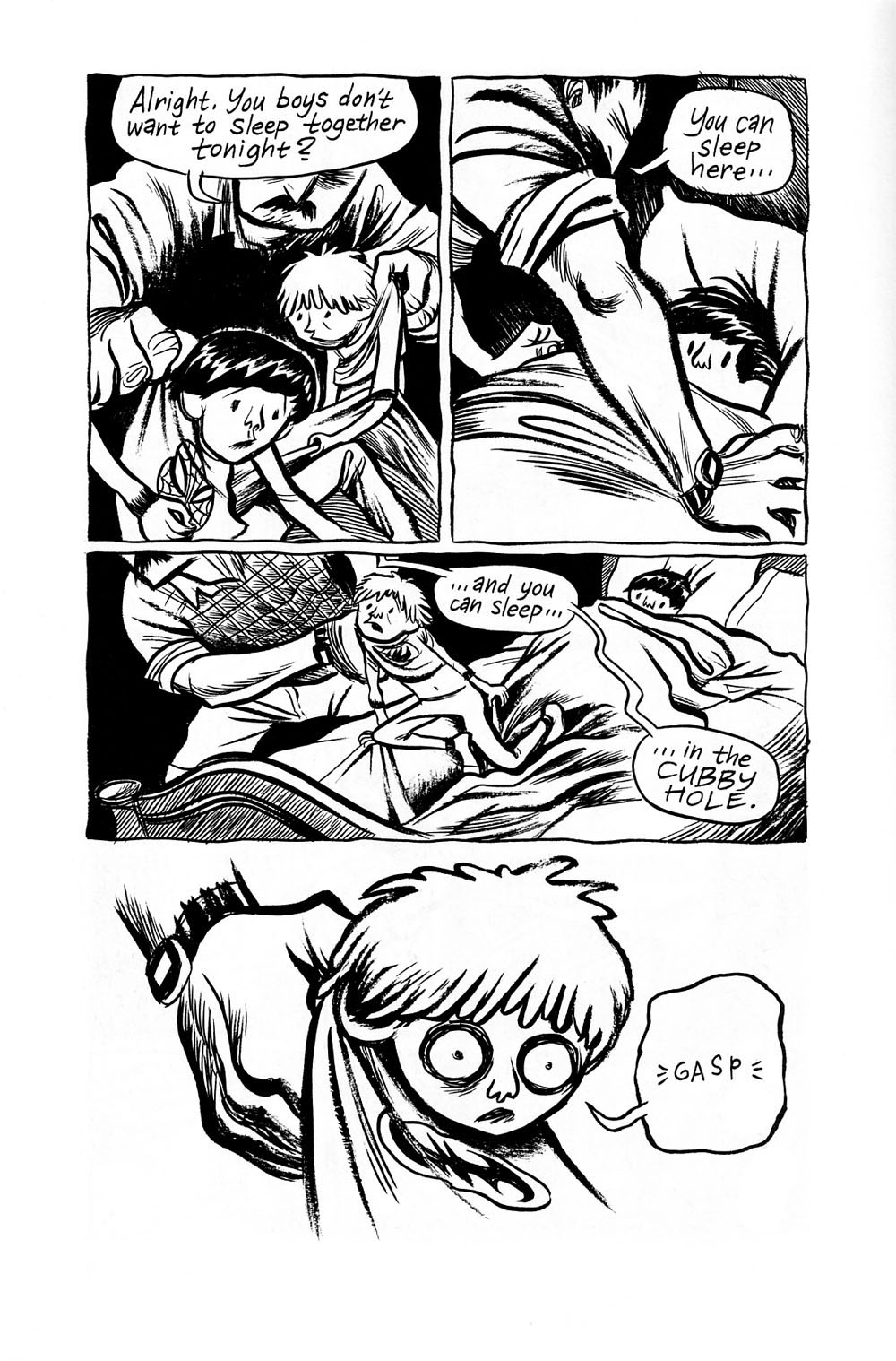 In his coming-of-age graphic novel, Blankets, Craig Thompson uses scale to convey the emotions of the main character. The story is in black and white, and Thompson relies on shading to create depth. In the portion of the story that is displayed (page 12), Craig and his brother have been fighting and their father comes in to scold them. The way Thompson has drawn the two boys in relation to their father is an example of relative scale. The smallness of the boys makes the father seem that much larger to them. The thin lines of the boys in relation to the massive arms and hands of the father, gives us readers the same feeling of fear and smallness that the boys are feeling. We can see this contrast very plainly in the last frame, as the father’s hand is huge, picking up his son by his shirt collar with ease. The shaded lines create depth and movement as we see his shirt being wrinkled and the lines of muscles in the father’s arm.