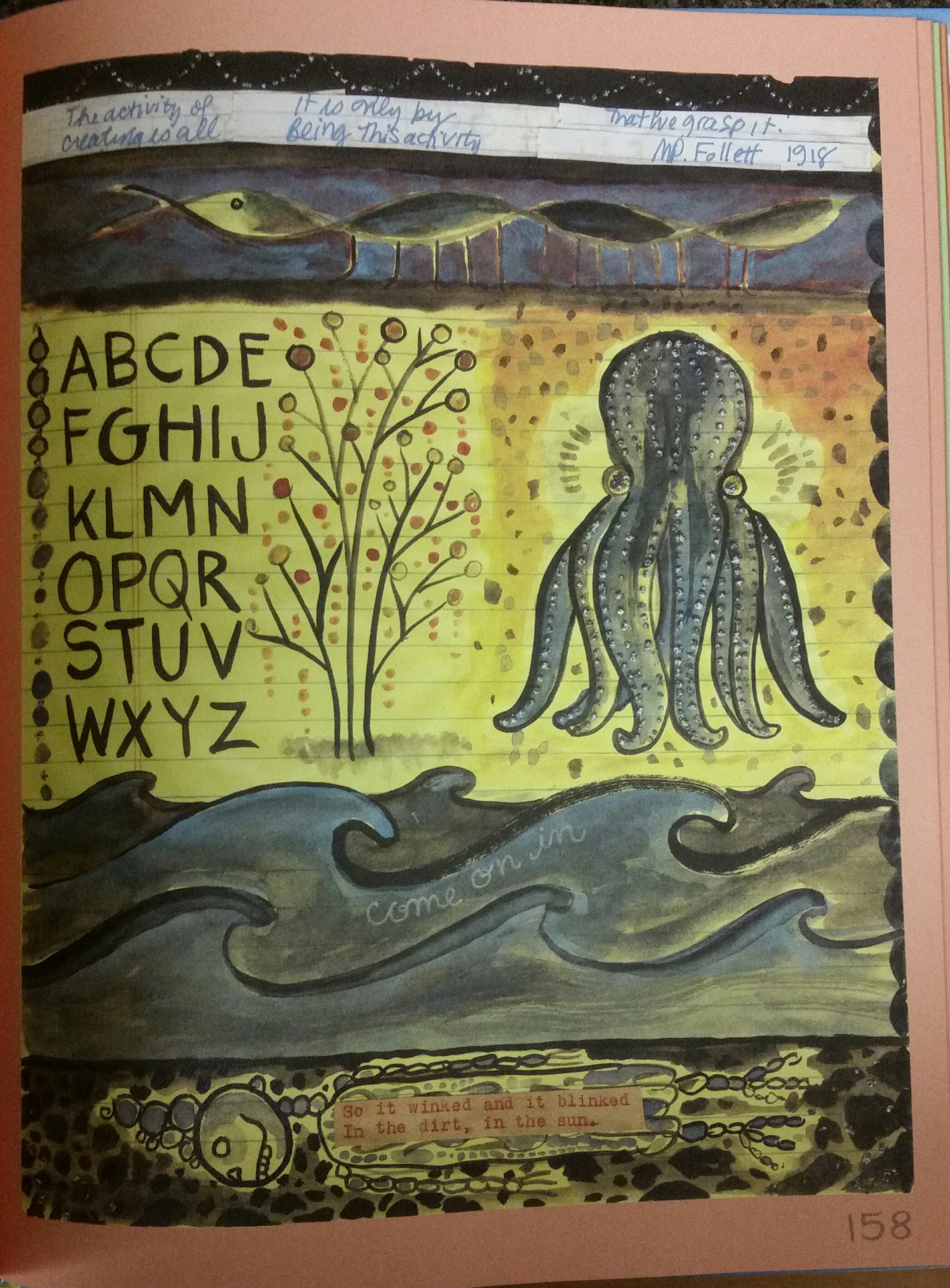 the I chose this Image from Lynda Barry’s What It Is, is because the use of scale here is interesting, with the octopus figure to the tree is clearly not proportional. In real life the tree is usually larger than an octopus. Referring back to Graphic design: The New Basics talks about objective and subjective scale. in this particular page I believe that this would categorize under subjective scale because we understand that usually letters are not supposed to be as big as a tree or a tree is not supposed to be smaller then a octopus. I think that the point of this type of scale is supposed to create emphasis on certain parts of the piece and create a path that your eye follows. in this piece first my eye looks at the two brightest things on the page, which is the yellow block that contains the letters, tree, and octopus. and from there the choice of scale draws you to look at the waves and the person figure beneath them, then finally the small letters that inside this person or at the top of the page. it is intended to make you look at the images and then the text. in this particular image there is not a lot of objective scale, because nothing is really the size that it is supposed to be, the only thing that might be considered objective scale is the words at the top of the page inside what looks like to be lined paper. something else that I notice in this image is that there are words inside the waves, with the choice of these words to be small and in the shape of the wave it suggests that the author wants you to engage in the image behind the words because they are shaped like a wave.
