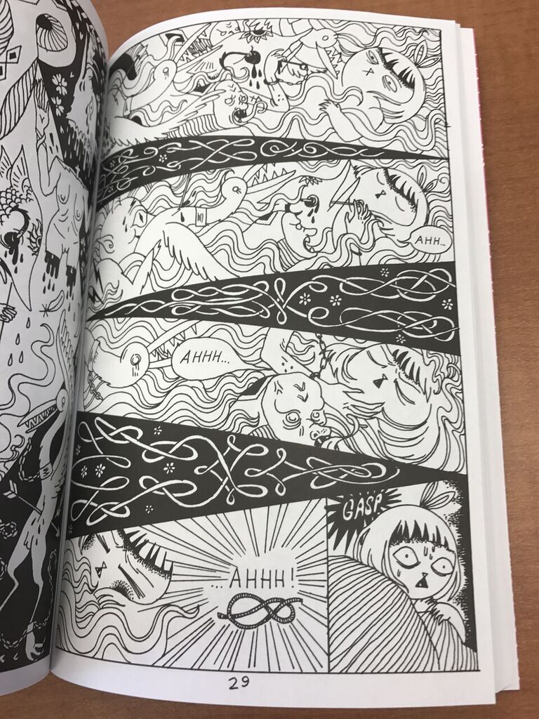 on the right. This page shows the part of the story where the main character has lucid dreaming of a dark and mysterious world. This style of layering is different from the style that Lynda Barry uses. The artist of this comic uses layering by creating three triangles that are stretched across the page. By adding a different shape to the comic on a 2-dimensional plane, gives it the effect that it is on top of the drawing that is going on in the background. Lastly, the way the artist drew the characters and used different forms of lines to give it that dreamy and mystical feel, uses layering to make sure that his audience can still see the main character clearly without adding any color.