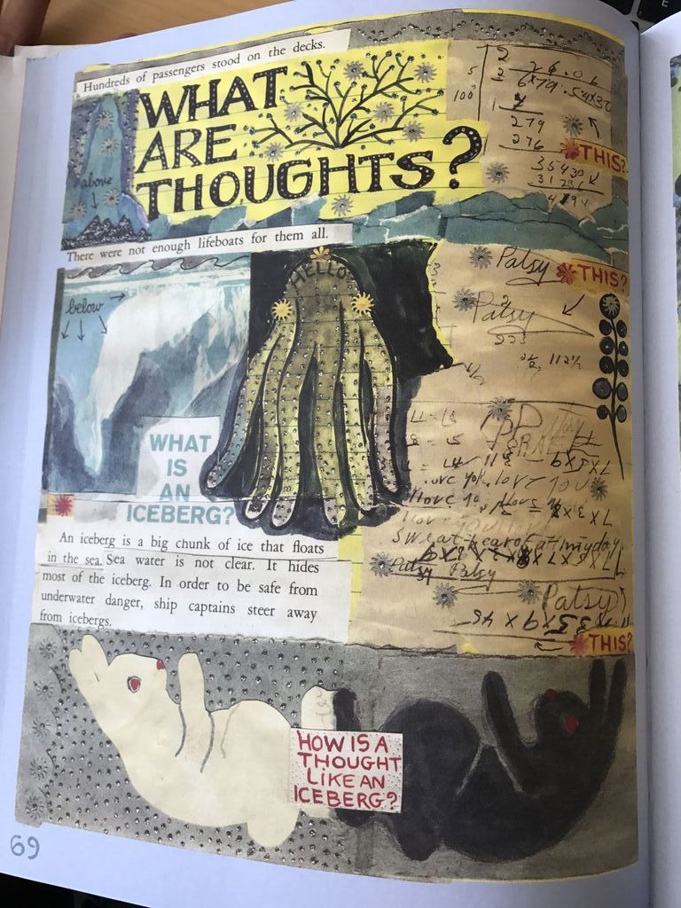 According to Graphic Design: The New Basics, layers are defined as simultaneous, overlapping components of an image or sequence. Throughout Lynda Barry’s What It is, she uses layering in a form of a collage as the theme and style of her book. An example of layering is shown on page 69, where Barry uses different types of papers, cutouts, and images, placed on top of one another. If you look at the yellow pad paper, you can tell that it is the base of the collage, because you can see the how the other cutouts are placed on top with the yellow paper peaking in between the images and cutouts. It is also easy to tell by looking at the octopus placed in the center of the page, where you can see the lines of the paper running across her painting. In addition, the edges of the paper show that Barry is creating a collage because of the imperfections of how she placed the cut outs and how she tore them apart to place them all together.