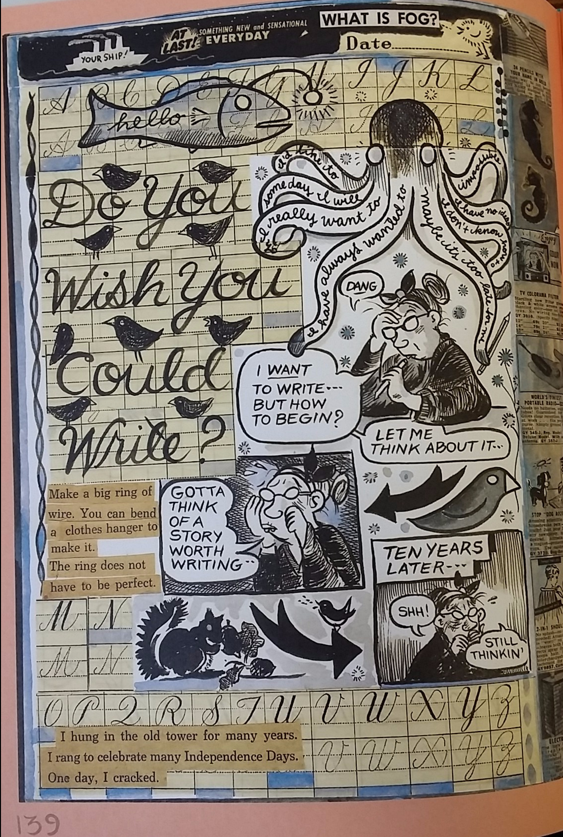 The glued word strips have a texture in the design all themselves. They look like cut outs which gives them a frame and that the design of the letters where chosen for Linda, rather than creating the texture her self. It feels bland and above the page because they are an outside source coming in. This contrast really well with her physical drawings. For example, the woman’s jacket is created from a shading and lines, but we gain the texture of the jacket because of Linda’s design choices. Also looking at the birds, fish, and octopuses we see Linda’s texture harmony and contrast with the page verse the outside sources. Her shading and lines give a much different texture than the pasted in clips or the darker side strip.