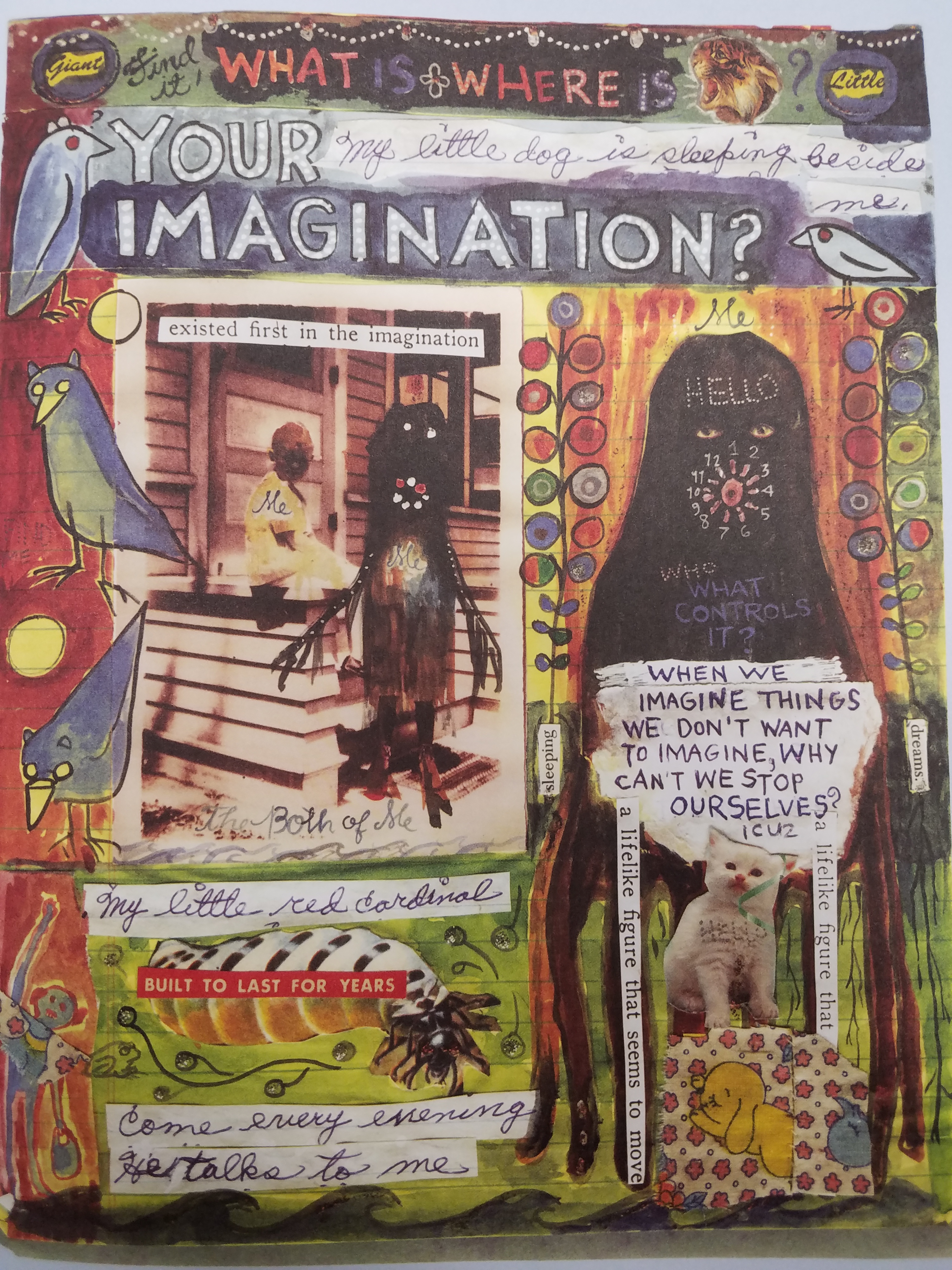 In this photo, Lynda Barry is exploring the difference between imagination and reality. The images that are meant to be reality are photographs with clear lines and sharp images. They seem hard and unchangeable. The imaginary portions, are drawings with unfocused images and edges that blur and meld to their background. They have a squishy feeling and could be easily manipulated.