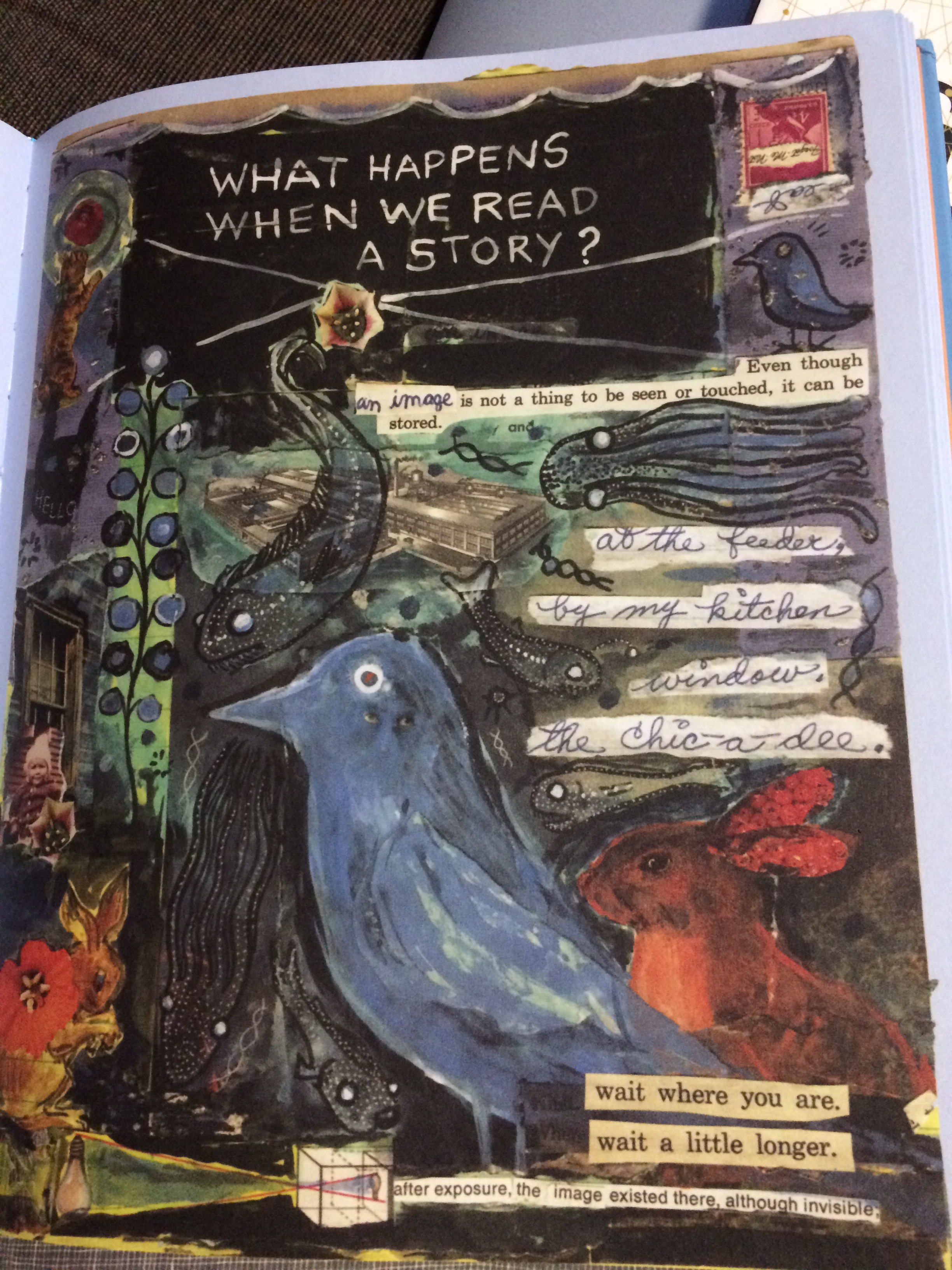 In this page of her book What It Is Barry uses contrasting textures to give each individual drawing their own feel, as they visually compliment each other on the page. The bird’s shading gives you fluffiness of it, manipulating the texture to bring its wings forward. The bunny on the right of the crow has a similar feel- the texture in the ears brings the eye directly to them. Their surface has been manipulated to give it a bumpy view. The vitality of this picture is mixed with the words. The top left text box has combining textures of word- this brings out the physical and virtual texture of the image. It gives the images deeper meaning, while drawing out all the different textures of the words. The textures blend the edges of the paper into the rest of the page. This gives the texture of the images more urgency, and takes away from the harsh texture of the words cut out.