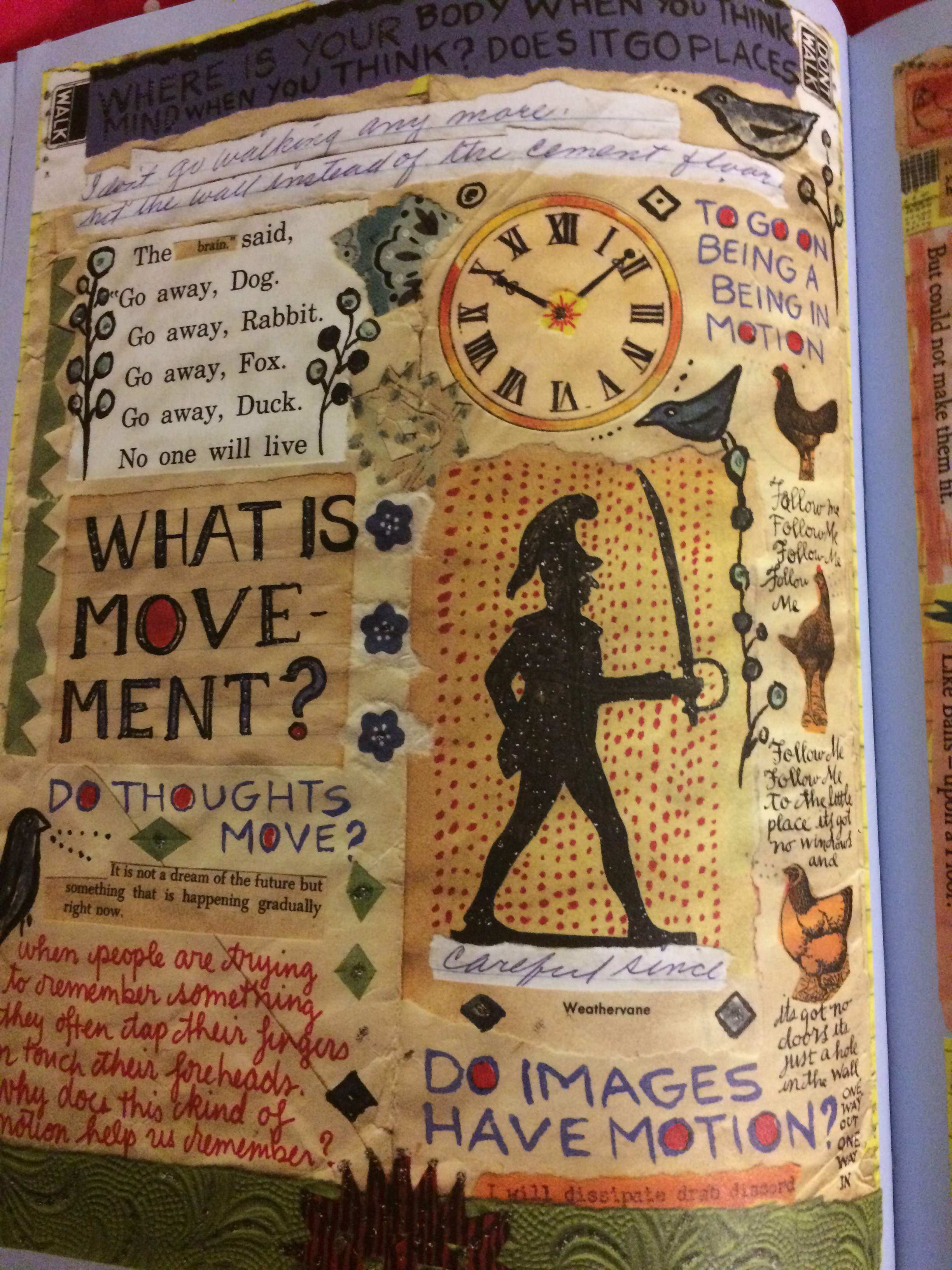 The layering of the clock outline on top of the background color connects the clock to everything else, including the cut and paste technique she uses by putting certain words on top of the other images. They give these words more meaning. Its easy to see why she would give these words power on the page; the “Go away” phrases show motion within their words. They create an image in the readers mind of the animals running away. She also uses the temporal layering technique by including the words with the images, overlapping them to create a new way of looking at the idea. The layering of the birds on top of other things connects this page to the rest of her book, where the birds always seems to be watching what is happening. By putting them on a top layer its almost as though they are the narrator of the book. Lynda Barry’s layering technique pushes her collage way of thinking into a visual aspect so that the reader can think more in the way she does.