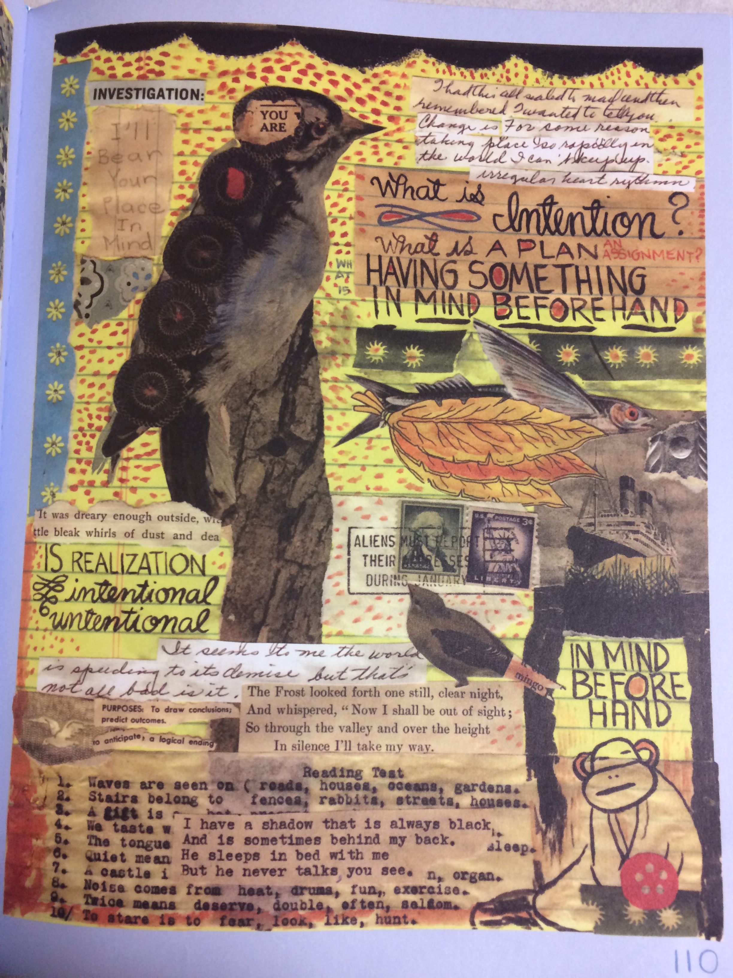 We are easily able to see the concept of layering in Linda Barry’s graphic novel, What It Is. Barry oftentimes uses mixed media and cut-and-paste laying techniques to create collages. On page 110 specifically, we can see numerous layers made up of different materials. Her initial layer is a sheet of yellow legal pad paper. On top of that, Barry has pasted smaller pieces of paper and paper cut-outs. There is evidence of cut-outs of a book with text, there are several cut-outs of birds of various sizes, and there are paper squares that Barry has layered with paints.