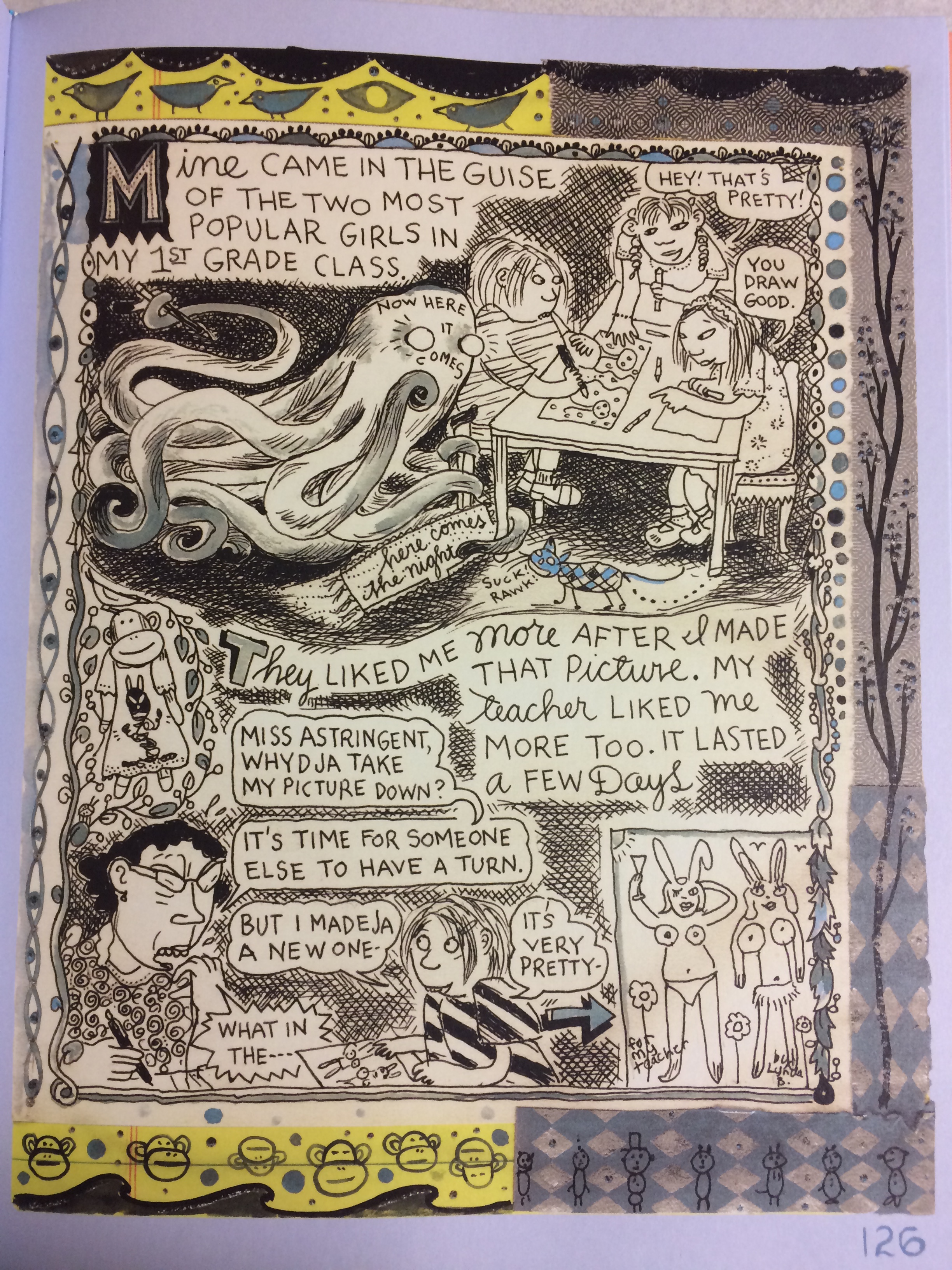 Page 126 of Barry’s novel is an example of the line work she uses to imply texture. The denser lines around the octopus illustrate a shadowy, dark space – perhaps of Barry’s mind. These lines dissipate into more crosshatches that are more wide spread, signifying the lighter space of the “real world.” Additionally, the blue and gray watercolor paints Barry uses around the inner border of the page create a smudgy, matted texture, and the paper outer borders of the page create the illusion of a chunky, wrinkled page.