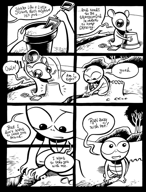 One more way that Thomas implies layers is when scenes last over several panels. It is really evident on the lower left panel and the one right above it. It almost appears that the black borders are added on top of the scene, there is a continuity in-between the frames that makes this possible.