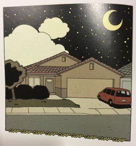 Unlike Linda Barry’s graphic novel, Yang’s work has a more realistic professional image. His work is not actually composed of different physical cutouts, but it does seem to use layers to create what we see. Working with this image on illustrator or Photoshop, in order to create a depth of field vibe where the clouds are behind the house and the house is behind the trees, the most ideal way is to use layers. If the author completed every single illustration, the way to create what we see, each illustration must be a separate layer, which would allow the author to simply put whatever layer, under another layer to create the illusion of depth of field.