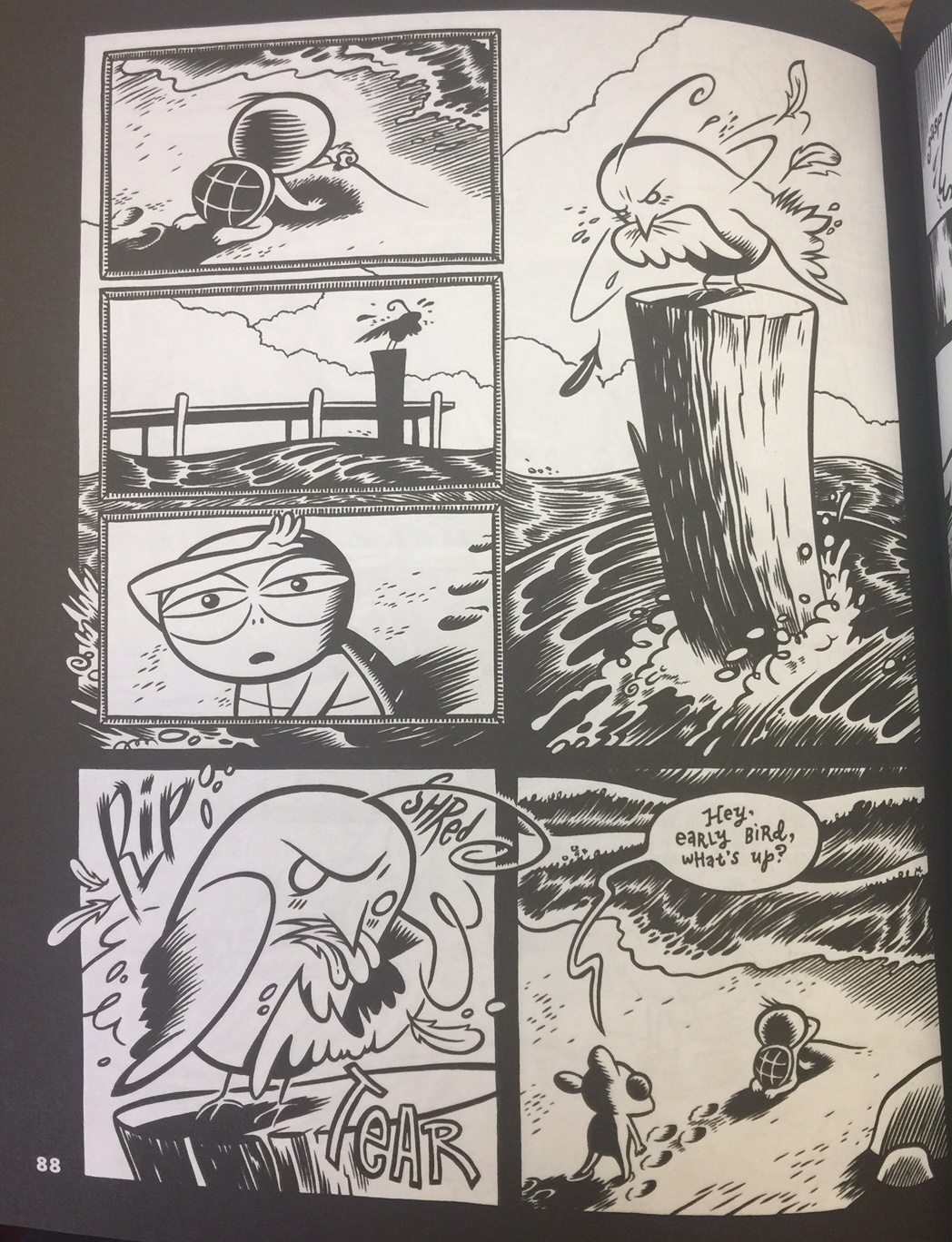 comic Goodbye Chunky Rice you can see a less intense form of layering. On page 88 of Thompson’s comic you can see that he uses a form of Temporal Layers. On this page you can see that each panel of the comic is a layer. However, in the top panels you can see that the three panels along the left side of the page have been layered on top of the big panel (background) that takes up most of the page.The layering makes it seem like the three side panels are part of the bigger panel. At the bottom of this page you can also see that the left panel is layered on top of the right panel because parts of the bird’s body hover over the next panel, while he is looking at what is going on. I feel like the layering used throughout this page makes it easier for the readers to understand and for the story to be told because the individual panels becomes an entire picture.