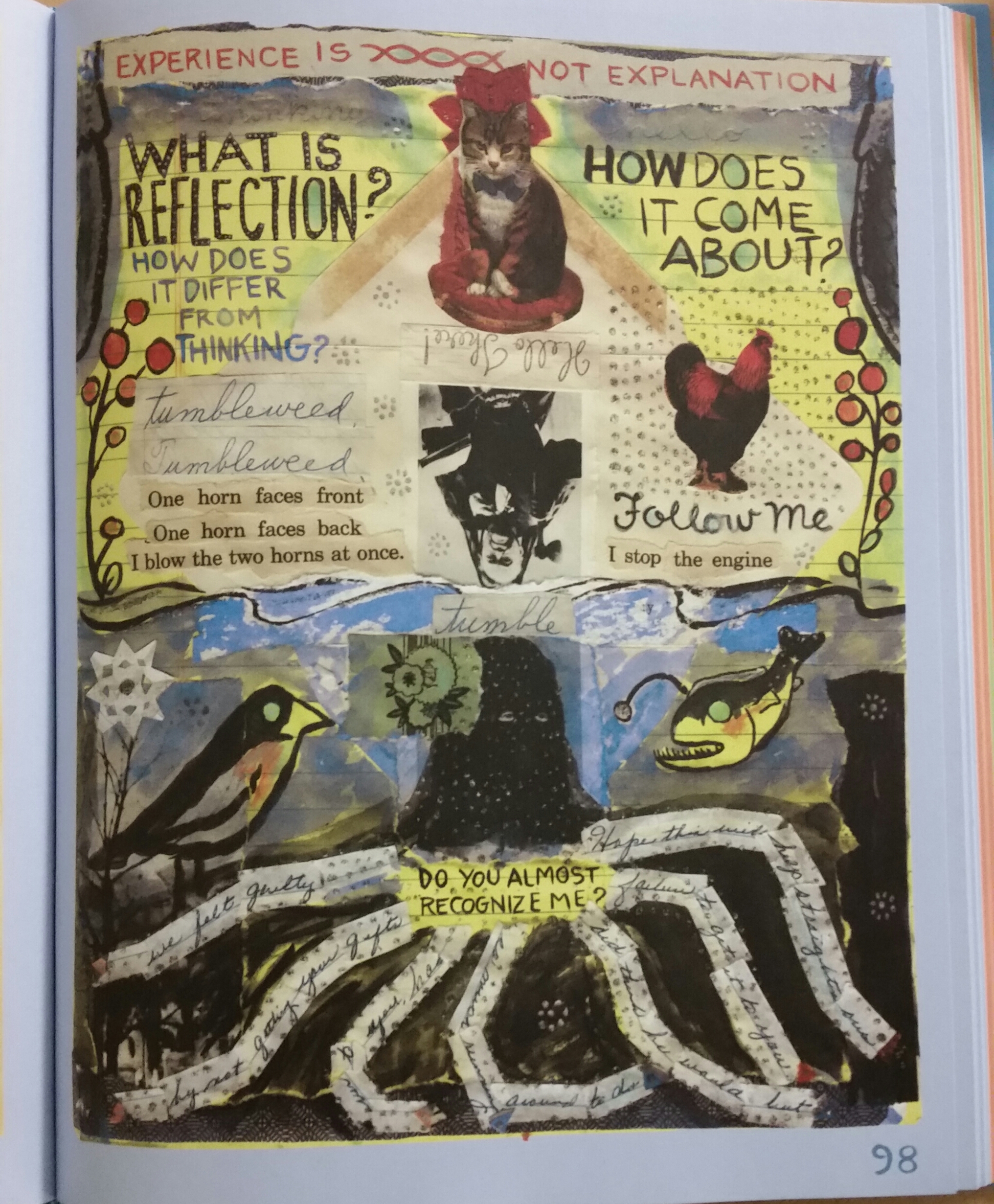 The first picture that I chose was from Lynda Berry’s book What It Is. the reason that I chose this page is because first it clearly demonstrates the Cut and Paste method that is talked about in Graphic Design The New Basics. This particular page does it in such a way that with the pieces that are “pasted” on the collage resemble an octopus like at the bottom of the page. Also on this page you see the idea of Temporal Layers in the sense that you can get a feel for depth and motion by the way that things are pasted, you can kind of tell what is in fro