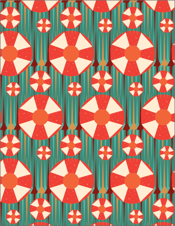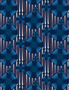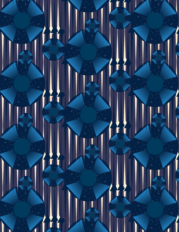 For my first pattern, I was inspired by a song called “Spaceman” by the killers and a sort of round-about area near the vet school on campus. First when I heard that we could look to a song for inspiration Spaceman popped into my head and I instantly knew what colors I wanted to use (those night time and star like colors), and the ideas I wanted to incorporate into this. Within the song there is a line that talks about beams of light coming from the sky which is something I knew I wanted to show in my design, then I saw the round-about that had these lines inside them that reminded me of the light beams and I wanted to incorporate that into the pattern. With the final product of my pattern I could see it being used as a wallpaper either digitally on a laptop or on an actual wall in like a SYFI loving kids room or maybe like a technology classroom. When it came to showing this in another color scheme I got 70’s wall paper vibes from the pattern so I made a scheme that was based off those bright oranges and blues.
