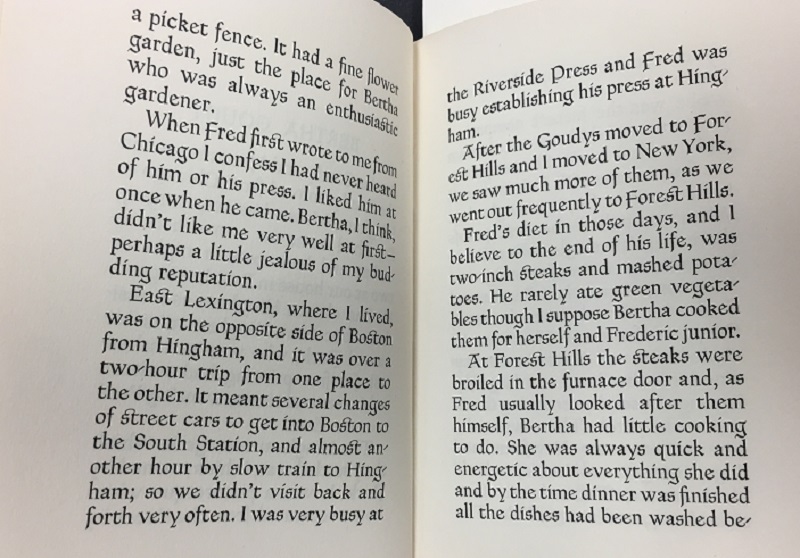 The key components to type anatomy are small variation that define what the type is, but every typeface has some constants, like a base line or a cap height. Some of the defining factors of typefaces are serifs, which give letters a nice endpoint that protrudes from the horizontal of the letter. Ascender heights and overhangs also are key components of a type face, they either break out above the cap height or dip below the bottom line to appear more proportional, without them some letters would appear smaller. The piece I chose from manuscripts archives is “First Lady of Printing” by Peter Blumenthal published in 1958. The typeface in this piece is a looks to be a traditional Baskerville with shaper serifs