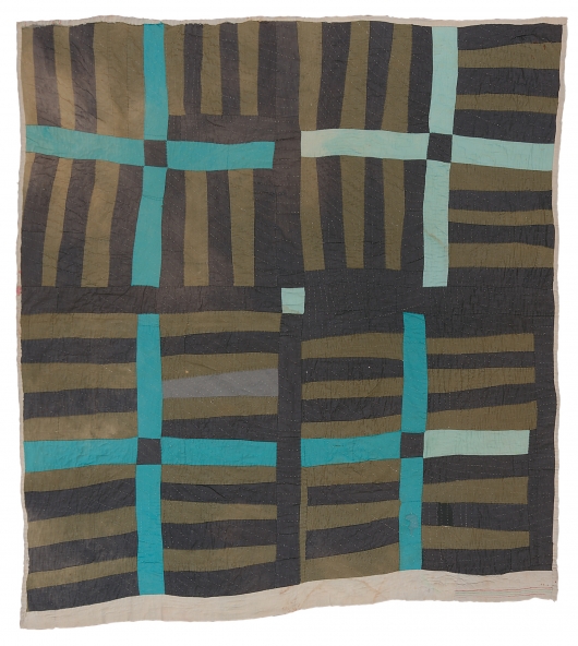 This quilt called “bars” is a geometric pattern, but the color interaction makes it feel different. The quilt feels a bit unbalanced because the bars are different lengths for the most part and the color pattern of the bars looks random. I think this quilt is abstract because the randomness of the length of the bars and the placement of the bars do not have a natural order.