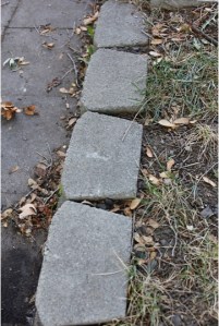 In the third image, my goal was to make the two cinderblocks appear primarily as planes, large flat surfaces with specific outlines and shapes. Attention is draw to angled edges of each shape, as well as their straight top and bottom edges. This view of the cinderblocks is encouraged by the tightly cropped camera frame: Only a small amount of negative space (grass and leaves and dirt) is visible around the blocks, and the left and right edges of the frame even crop out parts of the shapes. This encourages the viewer’s understanding that they extend into space. (There is also some interesting interplay between positive and negative space in this image, since the negative space between the cinderblocks may also be perceived as a positive shape: A long, skinny triangle.)