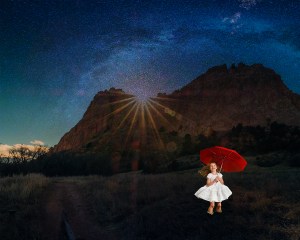 This is my digital collage featuring a Colorado mountain range, a young girl holding an umbrella, and a starry sky. This collage was made using photoshop.