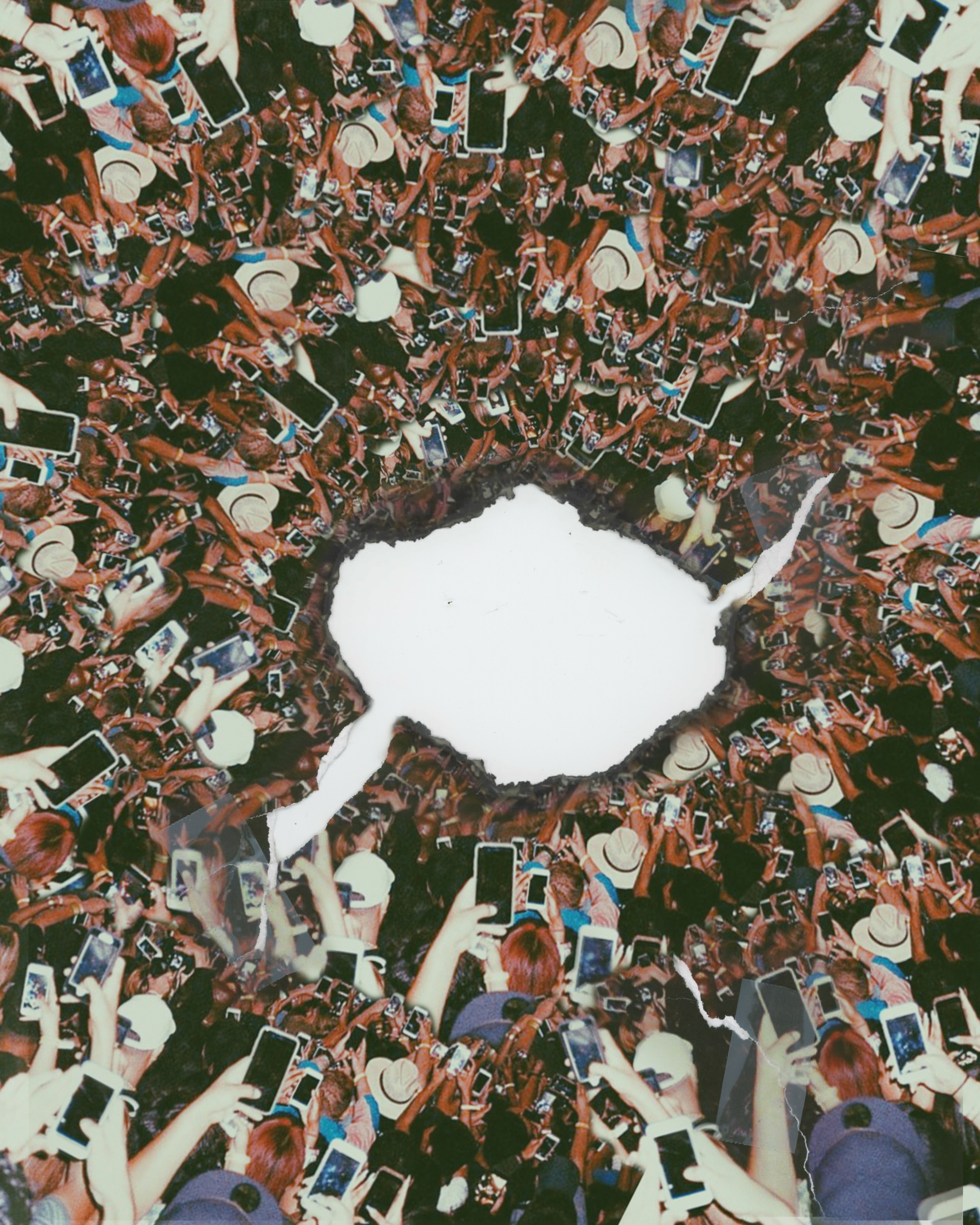 ce. I chose these images because of my passion for music and witnessing artist’s perform live. With that, I always like to use my own images, paintings, hand constructed items when creating any sort of piece; whether it is for class or for something personal, and I thought this imaged captured what artists don’t like seeing at there shows, everyone on their phones - Repetition and direction are used heavily in this photo. The stacking of layers (people) in a circular fashion lead the eyes around the photo then to the empty center. Texture is in this photo as well, I burned the inside of the image with a lighter then tore and taped over ripped edges to make the poster seem more authentic.