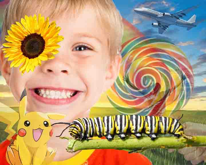 While creating this collage i started it with the young boy whom reminded me of my nephew. He has such a large smile in this image its almost hard not to smile back creating the emotion i wanted from the audience. I began asking my nephew what his favorite toy was and he said an airplane and his pikachu so i then decided to incorporate those in my image. I then began thinking back to when i was a child and how my brother and i used to catch caterpillars and bring them home to our nanny. The next image that came to mind was a giant lollipop because what little kid doesn’t like a giant lollipop? I also included my favorite flower the sunflower, Sunflowers are large, bright, and absolutely beautiful when in full bloom. The background of this collage is a rainbow with a man at the end and raising his hands in the air. While first assembling i wasn’t sure i wanted to include the man or just cover him up with another image. As i played around with the occupancy of the lollipop i decided it looked more interesting when you can see the man very subtly through the lollipop.