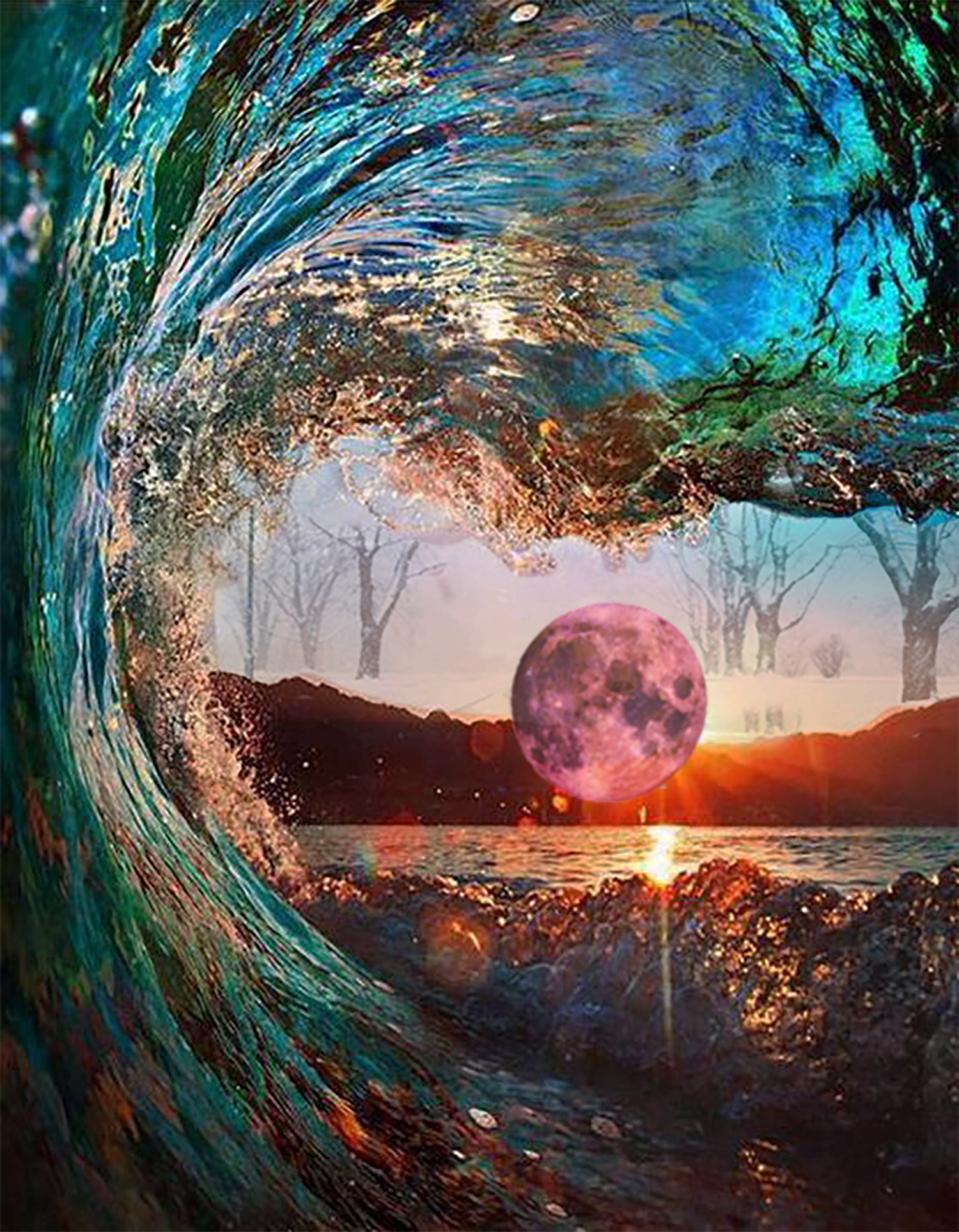 My collage all comes from images of nature. They are all bout different beautiful pieces of nature that can all happen in real life. The wave, the pink moon, and the snow in the background are all things that can happen in real life. In terms of what design principles and elements I wanted to used contrast in my collage. The contrast between the water and the mountains with the snow storm behind it. I also wanted to contrast the setting sun with a pink moon. I chose a pink moon to add more contrast to the collage and the pink color to balance the colors in the sunset and the colors of the water. I wanted the moon to not only mimic the sun, but also to stand in the middle to have the reader’s eyes follow the wave and crash on the moon and then focus on the contrast of the snow background with the warm beach environment. All together the image is in the shaper of an ellipsis with the moon being in the center. My goal was for it to resemble an eye with snow in the middle. My hope was that the viewers would see my collage and understand my personal interpretation. The eye symbolizes my eye. I come from southern California and I grew up on the beach, but I had always wanted to experience the snow. The collage symbolizes my eye looking from a sunny beach place into a snowy place, somewhere I had always wanted to be, this is why I ended up at Washington State University. My collage consists of all real elements of nature because they were all a reality for me.