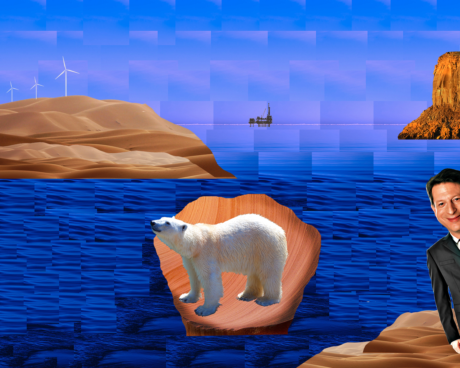Using these desert landscapes in conjunction with an choppy ocean view one can see that these do not belong. My main inspiration for the construction of the separate piece was the painting by Sandro Botticelli “The Birth of Venus”. In my research of the painting I found that interpretations of this painting have to do with the beauty that is the goddess Venus in that moment. In pairing that message with the images that I chose I want to viewers to thinking about the beauty that we may be losing to climate change. In the story of the “The Birth of Venus” the god of wind is pushing her towards her keeper on her right side. In my interpretation there are wind turbines pushing a polar bear to a charachatured Al Gore who is the creator of the popular documentary film “Inconvenient Truth” warning of the impending doom caused by climate change. Although there was research/ background information used to create this I still believe the message is clear and stands alone through the images I chose. I believe my image to have good contrast all of the image stand out from the different blues in the background. I feel my collage employs a good balance between all of the images on the page, they do not over power the eye in one specific direction. Another element of design I used was repetition as most of the background repeats it self to shape the background that can be seen. The specific tools that were implemental in creating this piece were many selection tools. For the smaller selections with one or two colors I used the Select> Color range option, this was very helpful for the things that were too thin or small to capture using quick select or cut it out with any of the lasso tools. For the background I used just a selection tool so I could copy the same chunk of background over and over. This caused me to lose the work aka the layers for the background as I did not know that flattening the image is not something one does till the end of the project as to not lose layers. For the larger parts of my collage such as the desert cut outs and other rocky structure cutouts I used the the regular lasso tool to cut out the shapes that I wanted since I did not need to select specific pixels I used that tool to get the shapes and cutouts that I wanted.For this work specifically I do think that creating it under a digital medium adds to its message and construction. Someone the piece in the work are too thin to be able to translate into a non-digital medium.