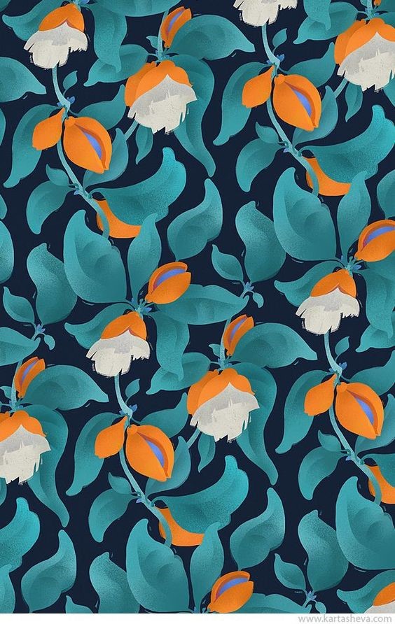 Both the shapes and the pattern they create are quite organic. The dark background intensifies the bright orange and blue of the flowers and the teal of the leaves. The bright hues of the orange and teal and the darkness of the background accentuated the white of the flowers. This color has a lot of visual energy because of the contrast within the image.