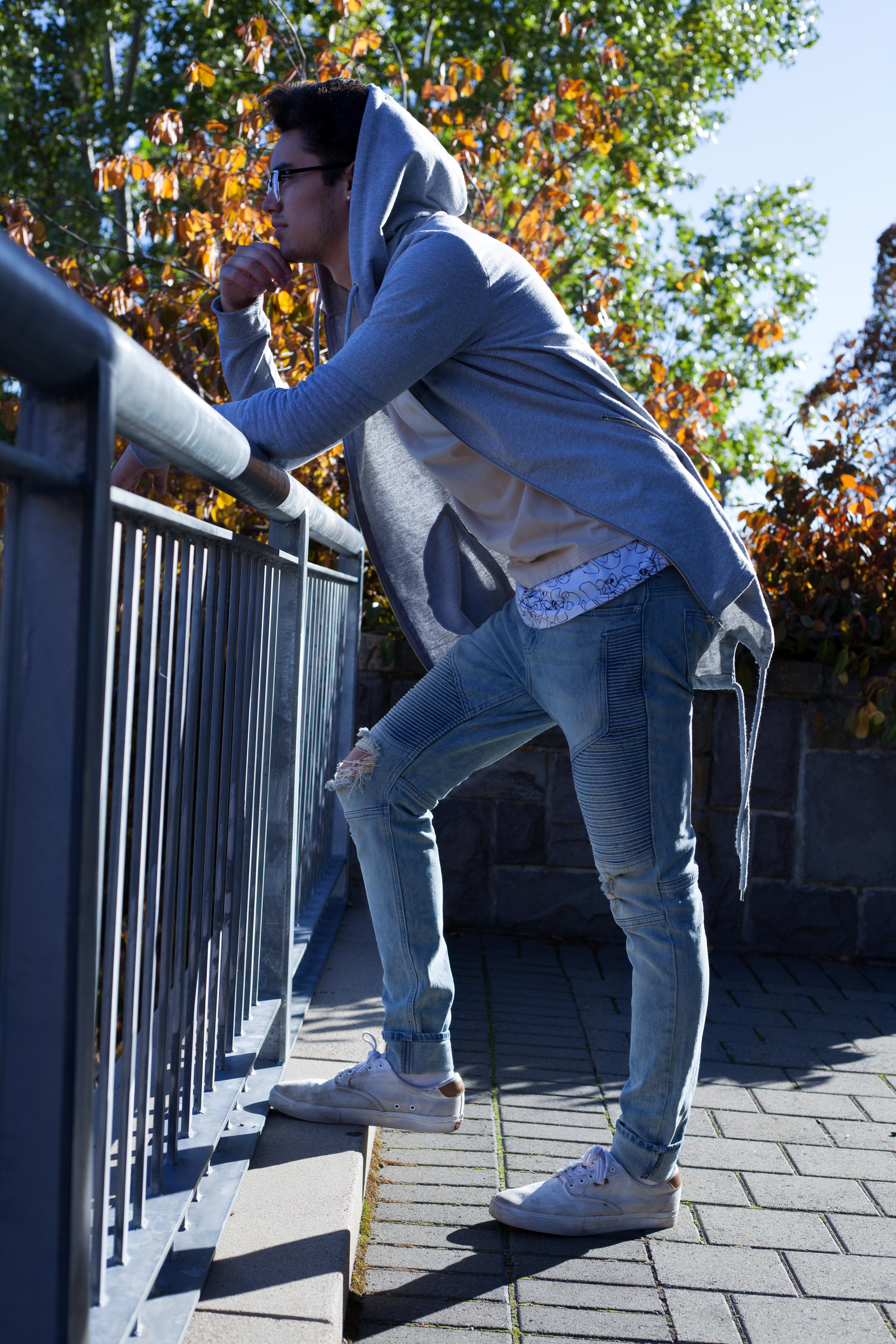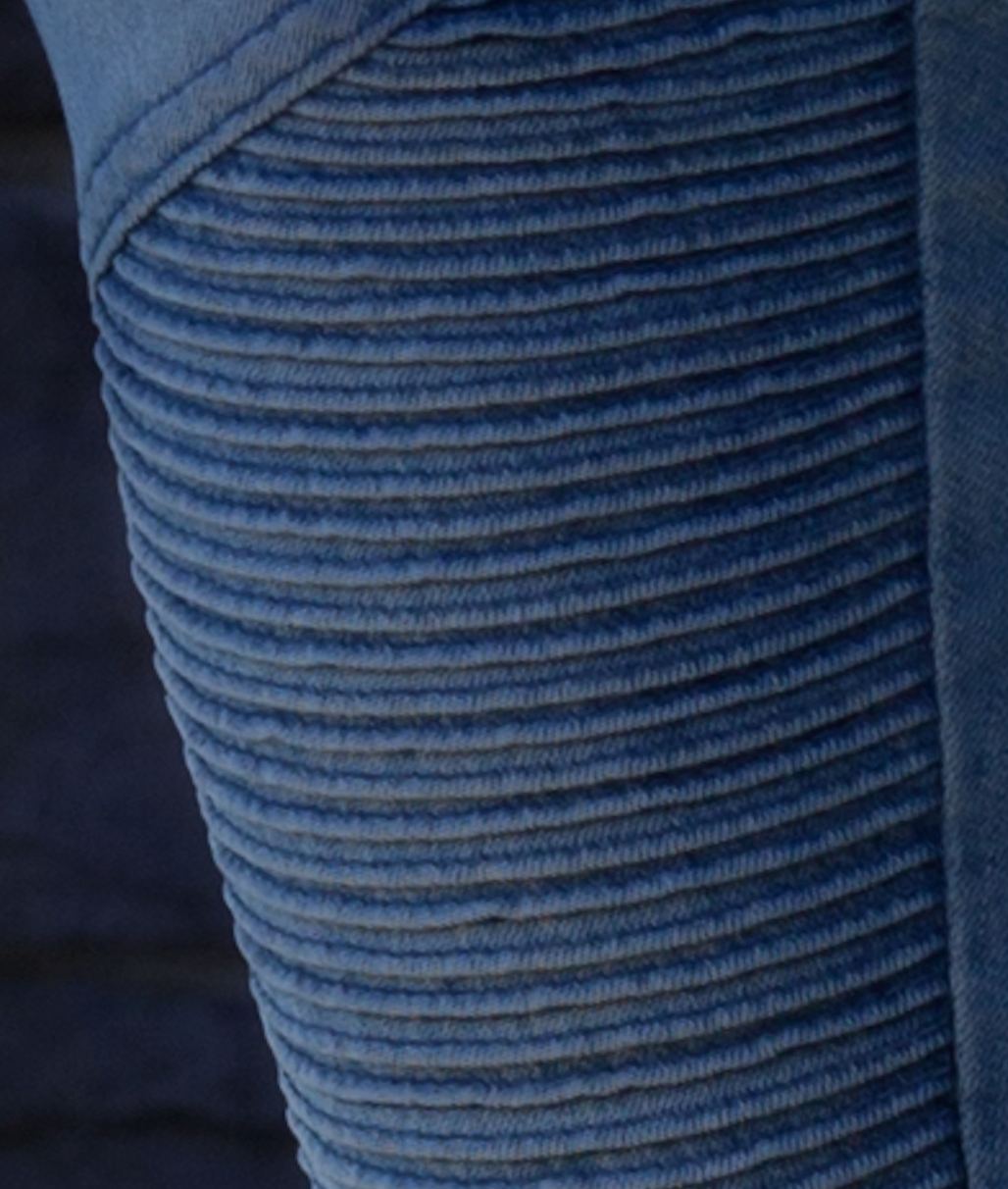 In this image I took, I will be focusing on the detailed pant ribbing this model is wearing. A close up look shows a stripped pattern with fiber detail to create even smaller patterns within the horizontal ones. Because of the slight wash on parts of the denim, it c